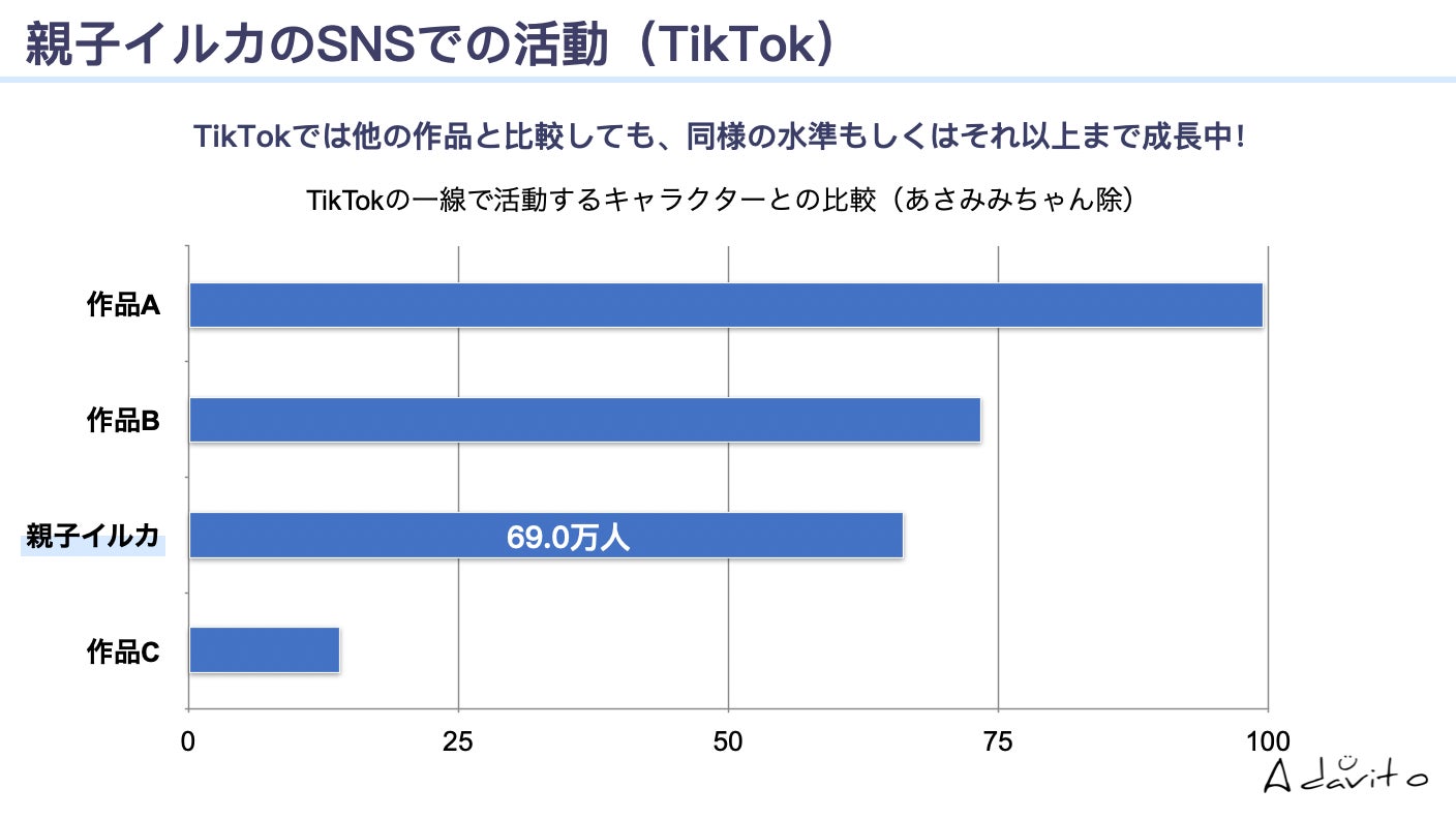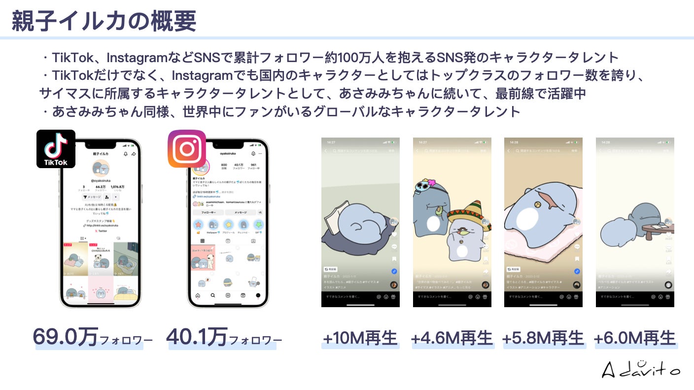 親子イルカは主にTikTokやInstagramなどを中心に活動をしており、TikTokは約70万フォロワー、Instagramは約40万フォロワーといずれも、多くのファンの方々に愛されており、SNSの総フォロワー数は100万人を突破しております。