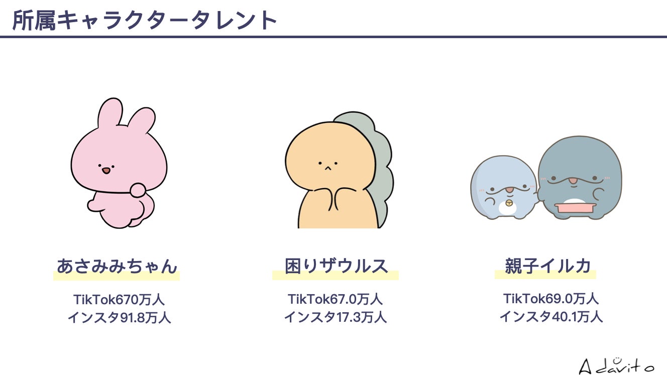 現在「Simple Side Mascots」には、「あさみみちゃん」、「親子イルカ」、「困りザウルス」の3体のキャラクタータレントが所属しており、事務所全体のSNS総フォロワー数は900万人を突破しております。
