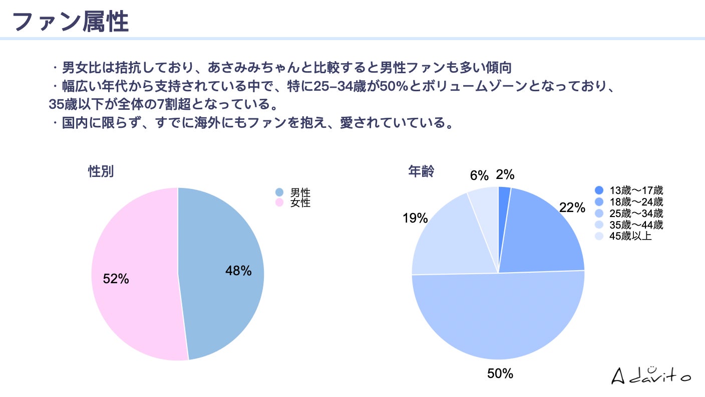 ファン属性に関して、男女比が拮抗している点が特徴の一つで、年代についても、幅広い年代から支持されている一方で、若年層の比率が高く、ボリュームゾーンは25歳〜34歳となっており、全体の約50%を占めております。