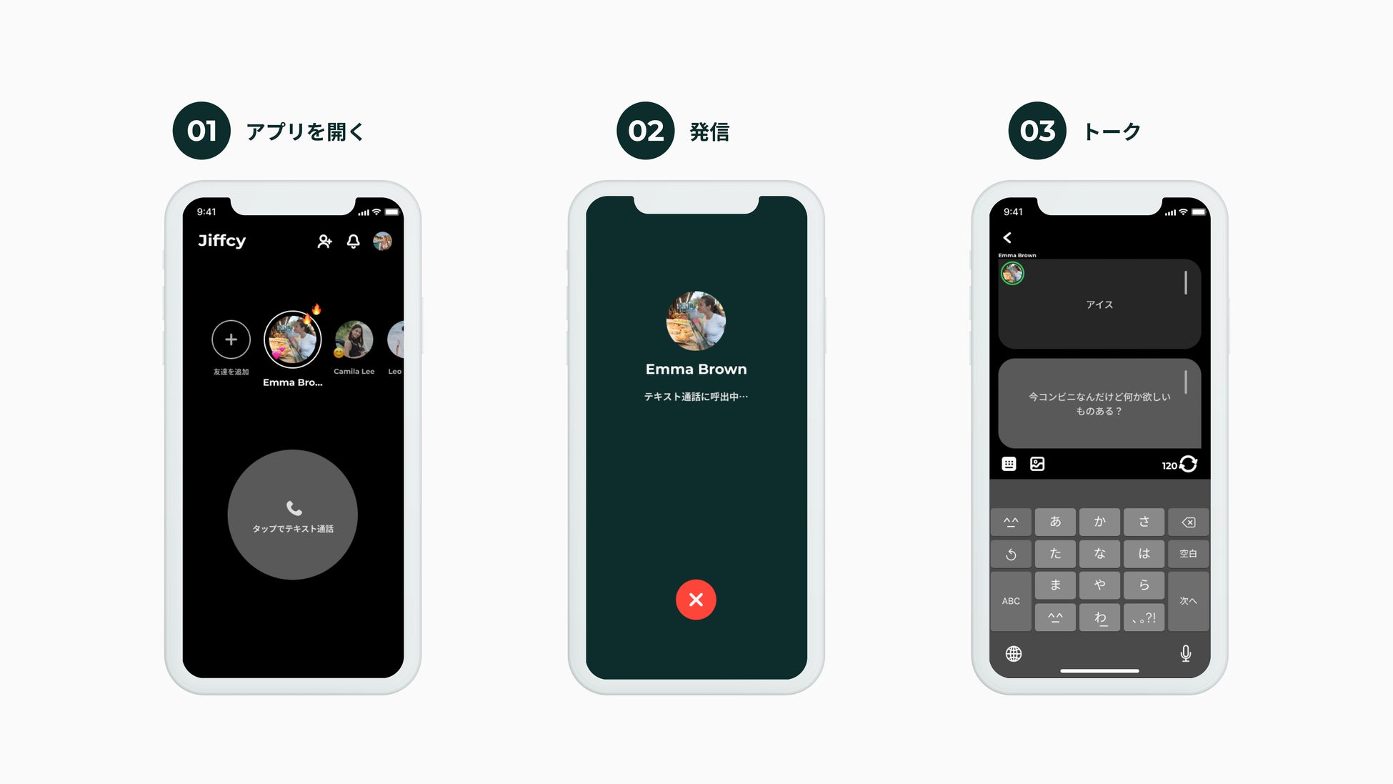 『Jiffcy』はテキストで通話感覚のコミュニケーションができる、便利で新しいテキスト通話アプリです。『Jiffcy』はリアルの友達、家族、恋人と利用する実名SNSです。電話のように相手を呼び出して、相手が応じると入力した文字が1文字ずつリアルタイムに表示されるリアルタイムトーク(特許取得済)をすることができます。電話している感覚で声を出さずにコミュニケーションをすることができます。