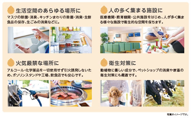 アルコール・化学薬品を使用しない、「貝殻焼成酸化カルシウム」をベースとしたカルシウムイオン水です。揮発しない性質で、水分が蒸発した後にも炭酸カルシウムとして除菌力を維持します。