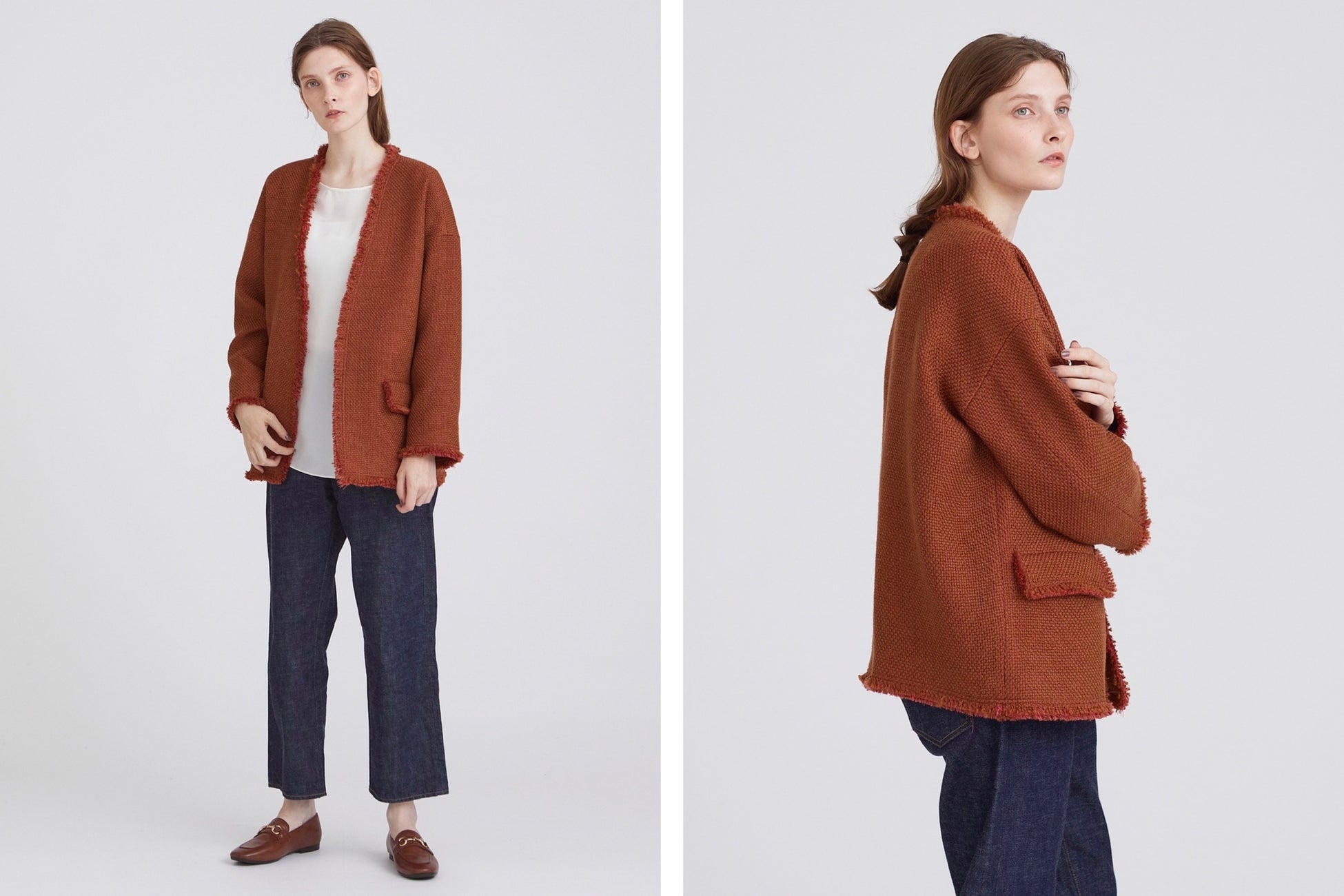 ボタンレスでさらりと羽織れるジャコットタイプ。ツイードのきちんと感は残しつつ、とても軽く、フリンジ状にほどいたエッジがラフな印象に。程よく力の抜けたオーバーサイズシルエットは、デニムに合わせてカジュアルに、ワンピースに羽織ってきれいめに、シーンレスで多様に着まわせる新しいツイードジャケットです。