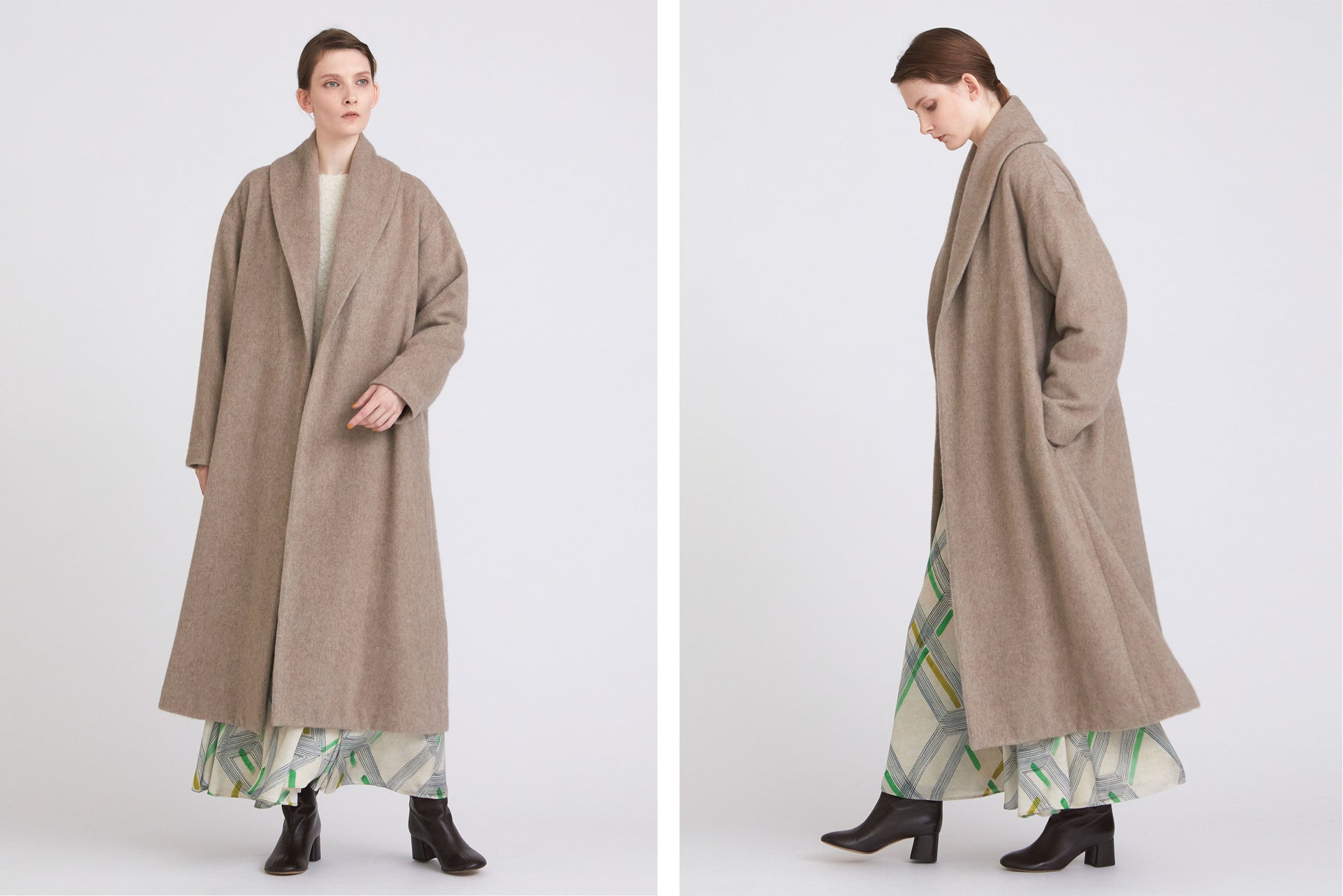 非常に滑らかでソフトなカシミヤを100%使用した贅沢なロングコート。上品な素材を活かしたエフォートレスなローブ型。袖通ししやすく、静電気も起きにくい、たいへん軽くふんわりとエアリーな着心地でとてもラグジュアリーな一着です。