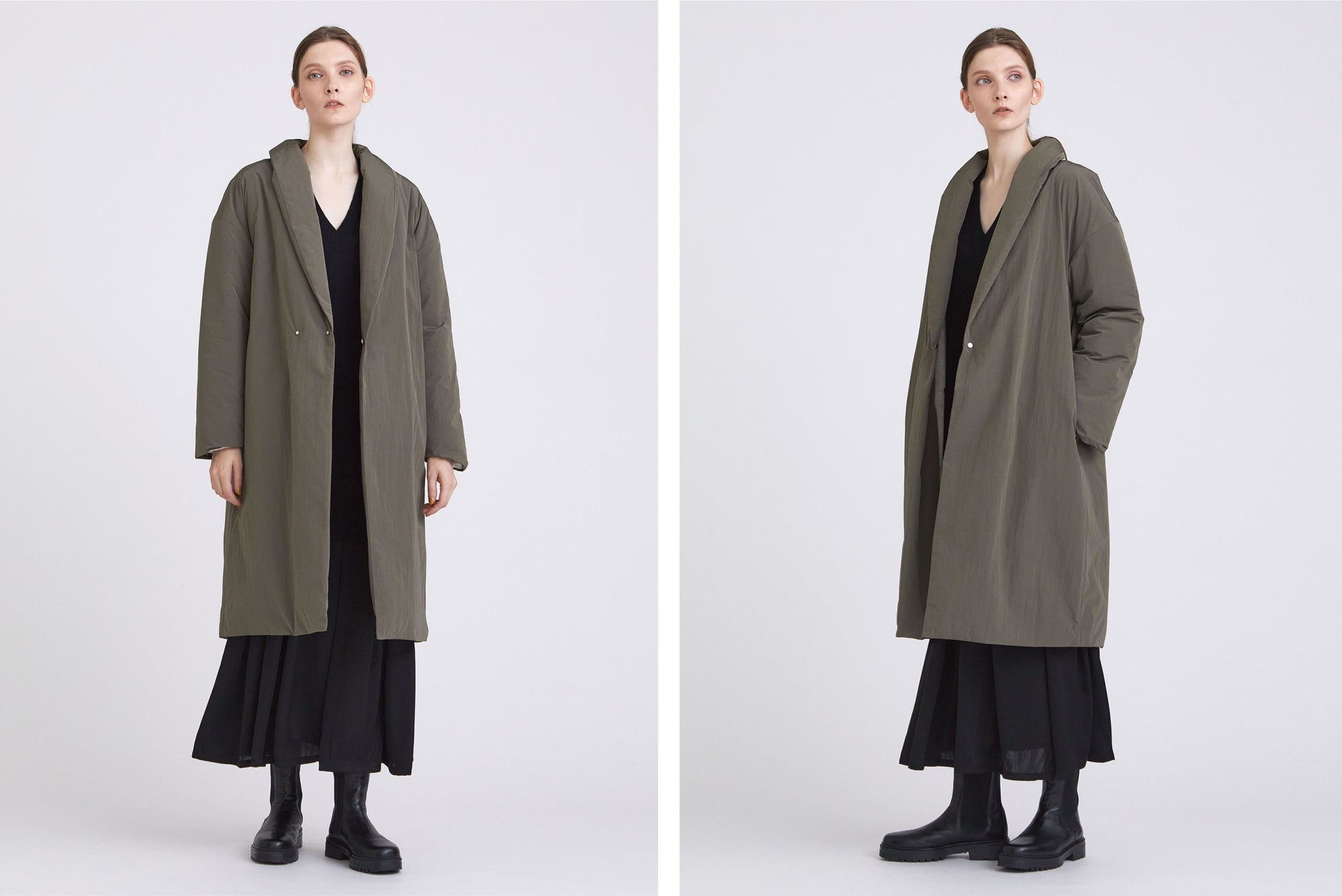 羽織った時の雰囲気が様になるようにサイズ感・肩のドロップライン・丈感など徹底的にこだわり抜いたパディングコート。着ぶくれしない洗練されたシルエットで、ワンピースやワイドパンツなどゆったりとしたアイテムに合わせてもすっきりとした印象に仕上げてくれます。ダウンのように保温性もあり、真冬にも着用いただけます。