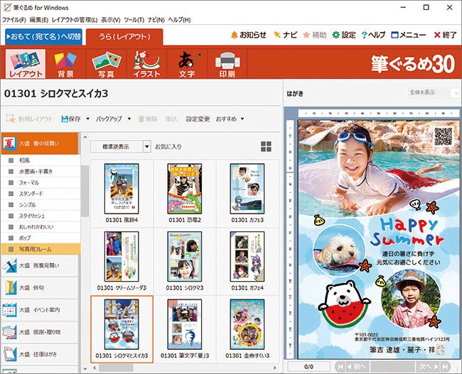 筆ぐるめは、「たのしく・かんたん・きれい」をコンセプトに、パソコン初心者でもかんたんに使えるはがき作成・住所録管理ソフトです。筆ぐるめ 30 大盛は、特典として、様々な場面で利用いただけるイラスト・レイアウトを1,000点、さらに日本語フォント3書体を追加した製品です。暑中見舞いや季節の挨拶状に加え、入学・卒業報告、引っ越しの案内、名前シールや名刺作成の他、小学生向けのスタンプカードや時間割(学校や家庭のスケジュール表)の作成、ビジネスに使える熨斗、挨拶状、DM、うちわなど、様々なシーンでご利用いただけるコンテンツを用意しております。