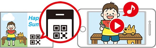 動画投稿サイトを利用し、投稿した動画のURLからQRコードを作成。挨拶状にQRコードを貼り付けて、スマホなどでQRコードを読み込むことで動画の閲覧が可能です。家族旅行、スポーツ、結婚式などのシーンを写真だけでなく、動画を添えた新しいスタイルの挨拶状が作成できます。