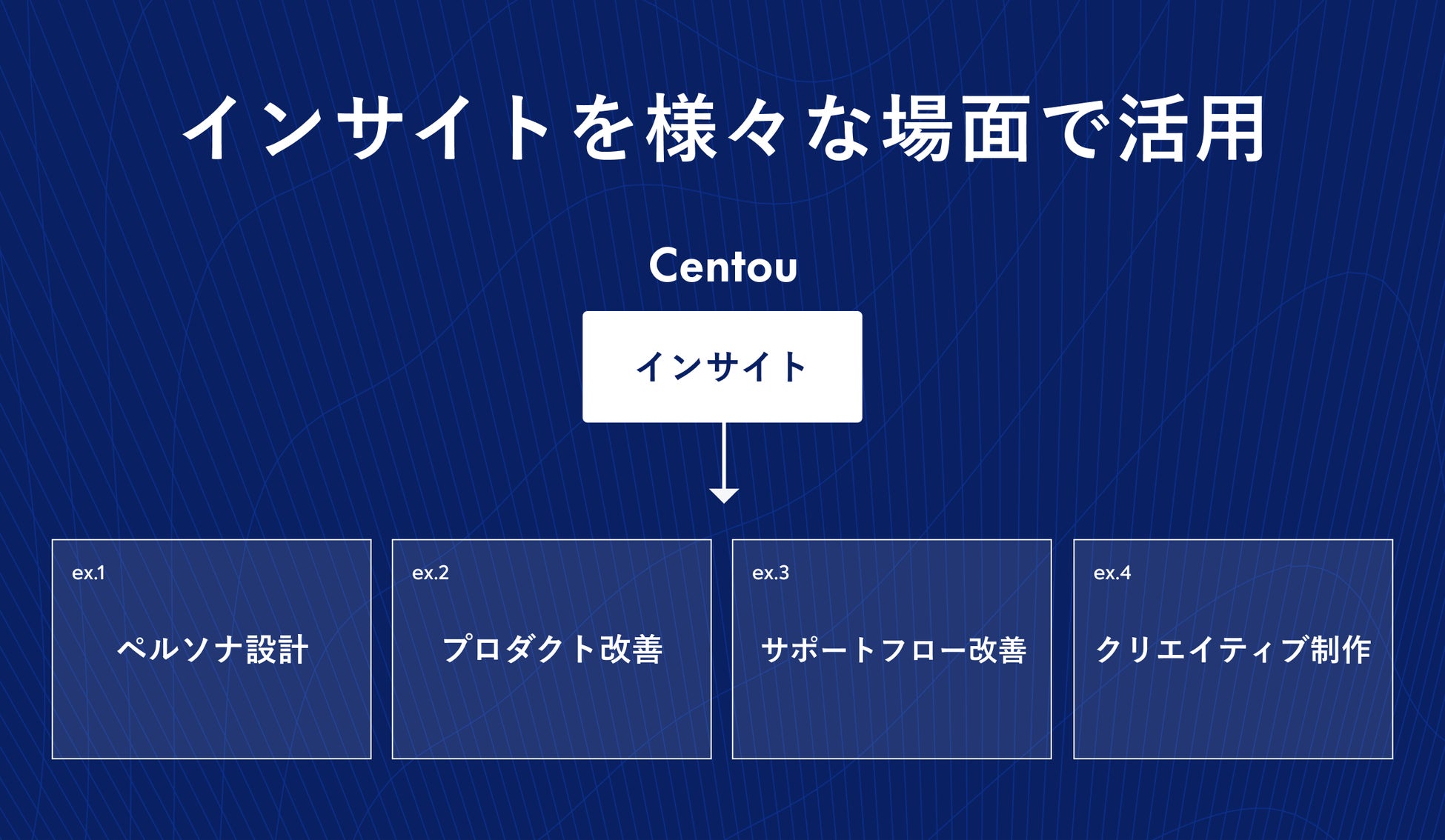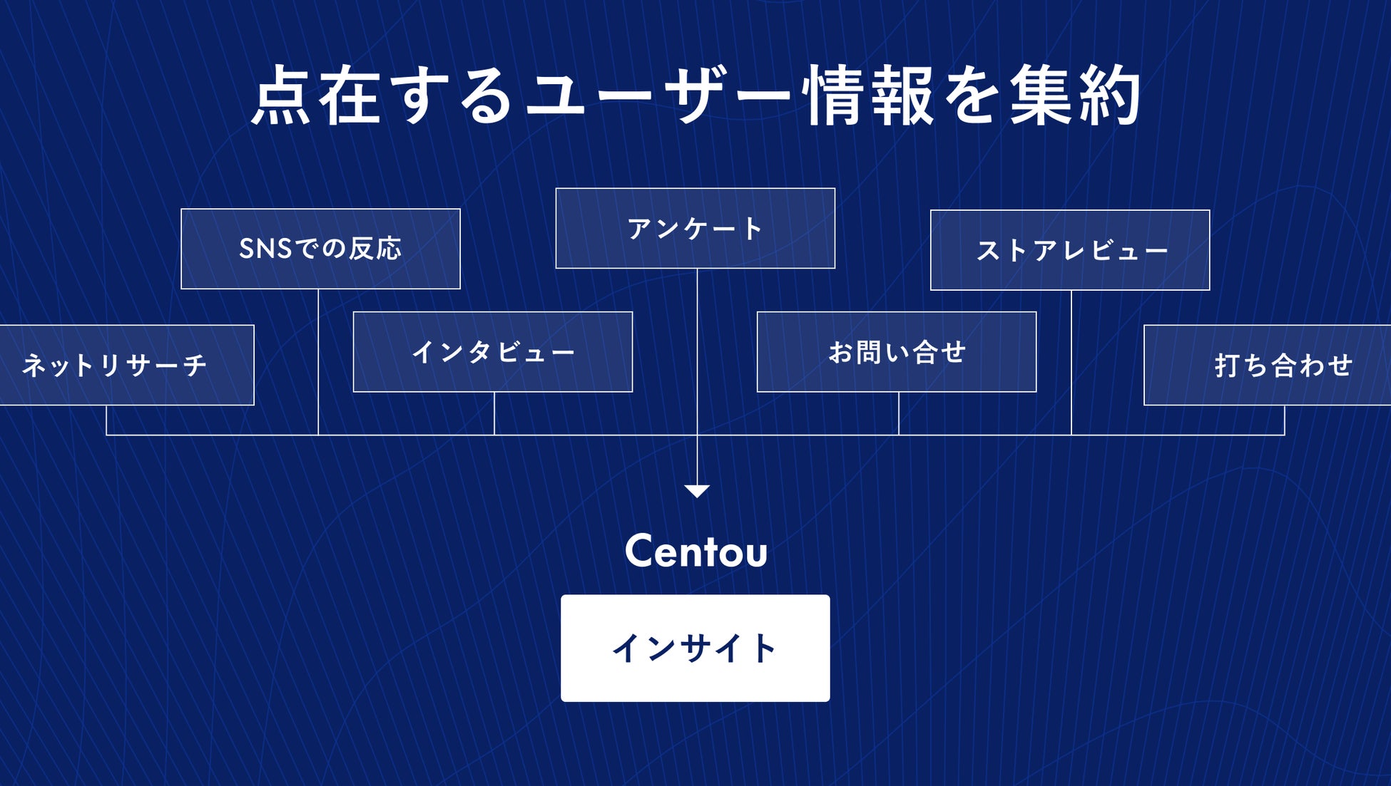 Centouでは、ユーザーインタビューや、お問合せなど、あちこちに散らばるユーザー情報を、集約し、「インサイト」という単位でまとめることができます。まとめられたインサイトは、ペルソナづくりや、プロダクト施策、マーケティング施策などさまざまなシーンで活用することができます。