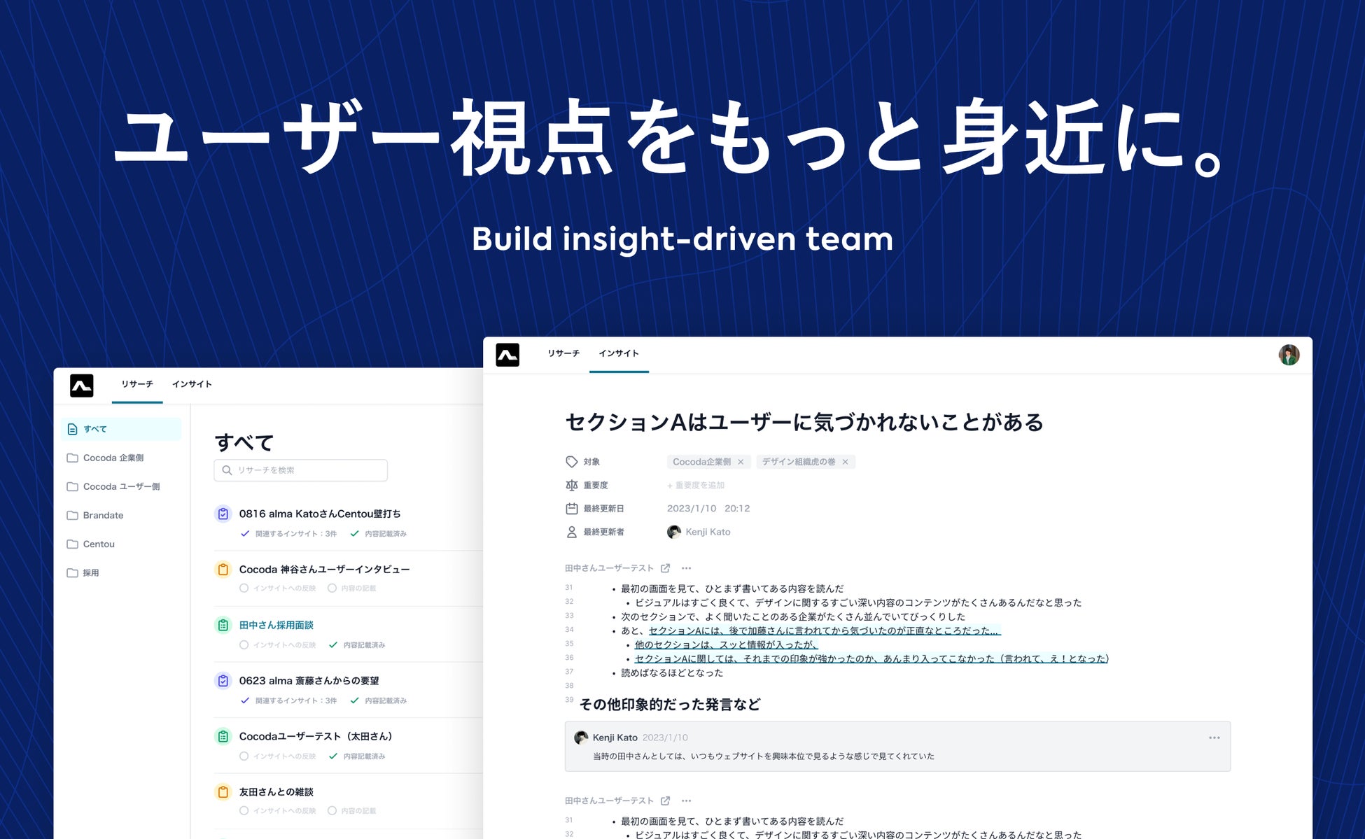 Centouは、ユーザーインタビューや、ユーザビリティテストなど、「デザインリサーチ」(またはUXリサーチ)と呼ばれる領域で活用できる、ユーザーインサイトを蓄積・管理できるサービスです。