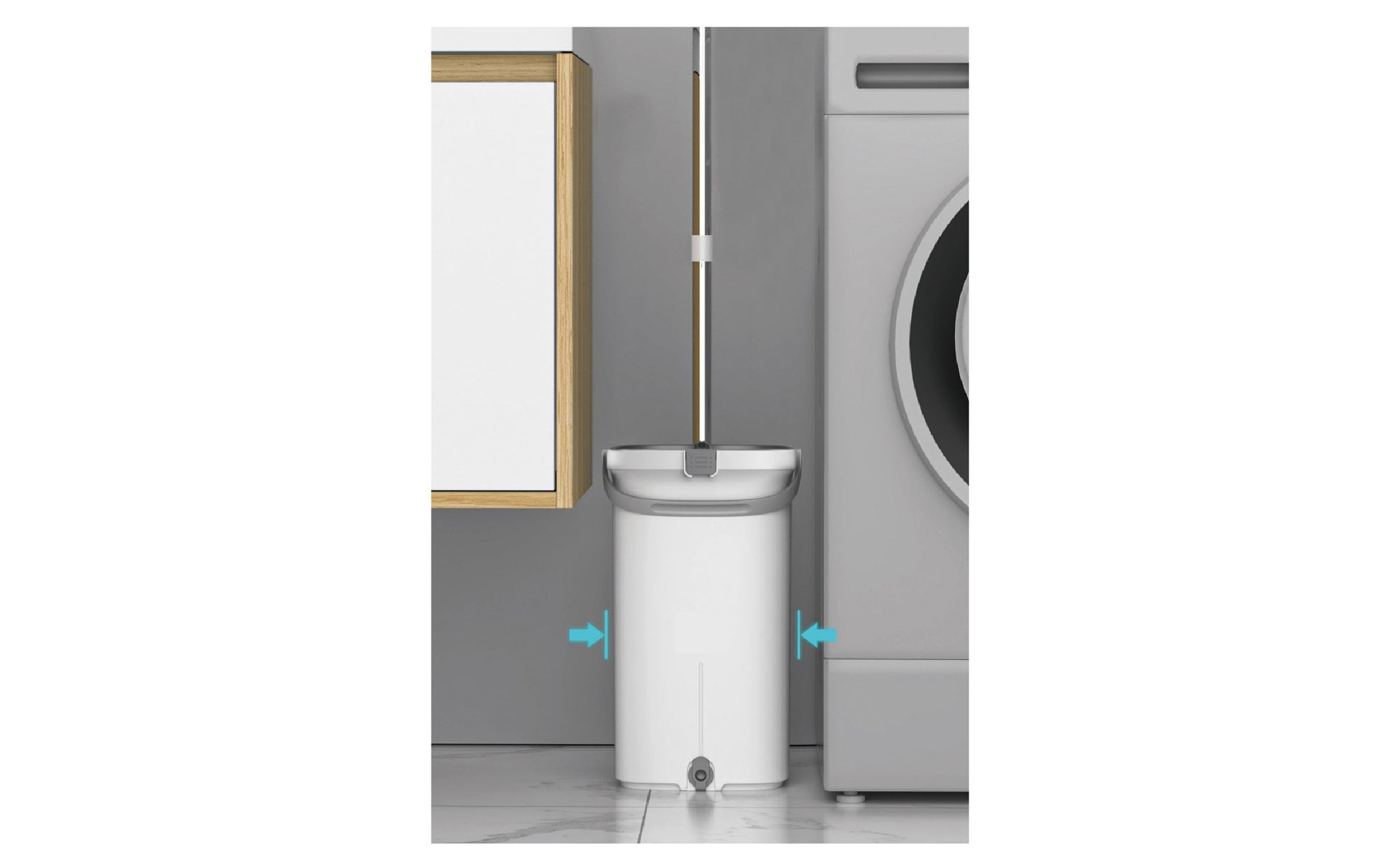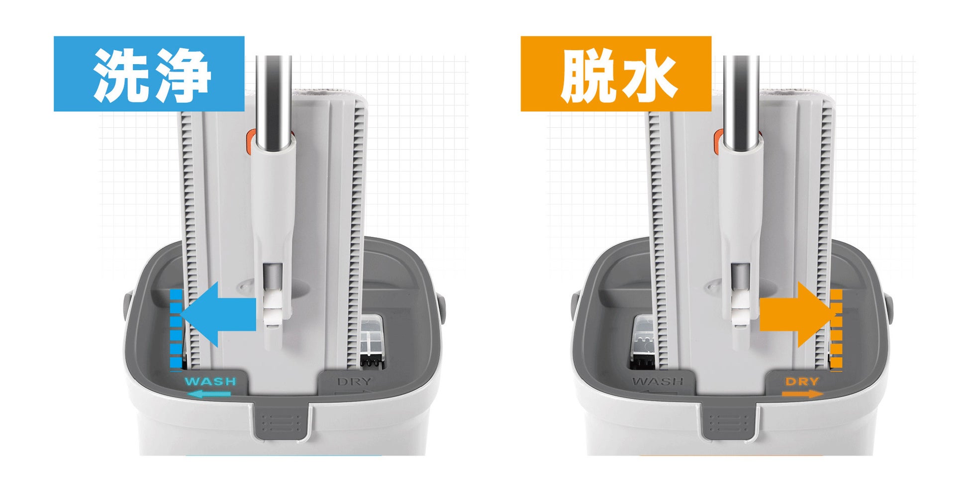 モップをバケツの洗濯口に差し込み、モップを上下に数回動かすだけで洗浄と脱水が可能です。