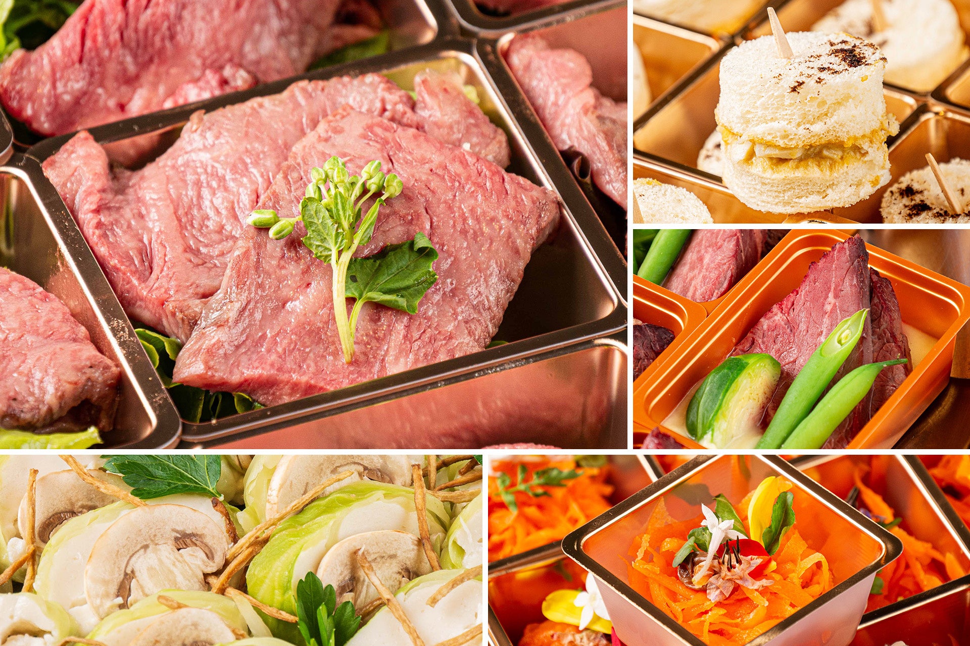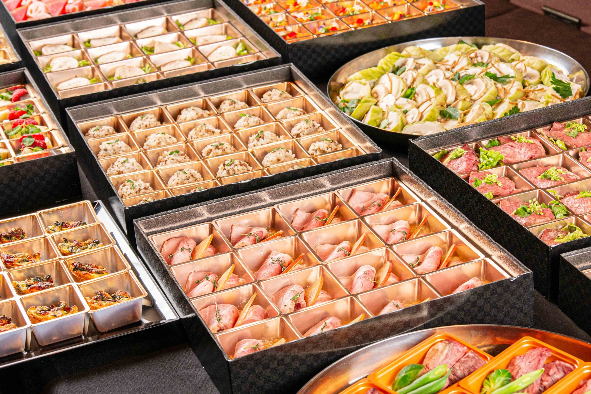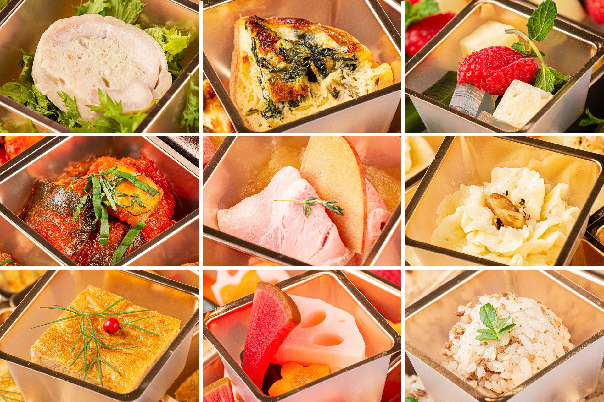 ベーコンと黒胡椒のグジェール、色々野菜のラタトゥイユ、キャロットラペ 菜園風、エビと長芋のスパニッシュオムレツ、契約農家の野菜を使った自家製ピクルス、豚肩ローストりんごのソース、牛ひき肉と牛蒡の手毬おにぎり 山椒風、ブルーチーズのポテトサラダ、鶏むねと鶏もものバロティーヌ 金山寺味噌と九条ネギと共に、ご馳走季節のキッシュ、トリュフ香るたまごサンド、季節のフレンチ風あんみつ、白身魚のシューファルシ 白味噌風味ソース、ローストビーフ 赤ワイン柚子胡椒ソース