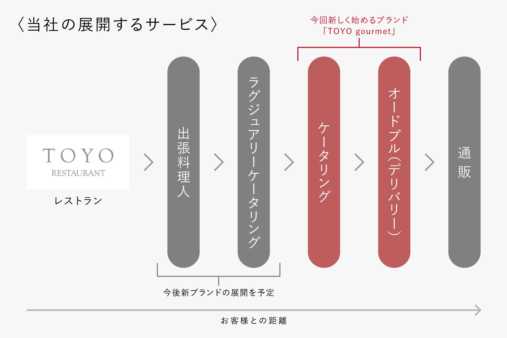 大切な方へのおもてなしをはじめ、小さなお子様がいて外出が難しいご家庭や、ご高齢のご家族がいらっしゃる方にも、“レストランに行く”のではなく、“レストランが来る”という新しい選択肢をつくりたいと考え、このたび、私たちは「TOYO gourmet(トヨグルメ)」をリリースいたしました。