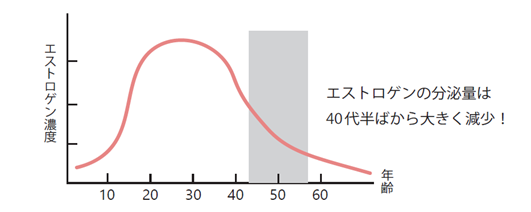 エストロゲンは、30 代後半から徐々に減りはじめ、45 ~ 55 歳で急激に減少していきます。