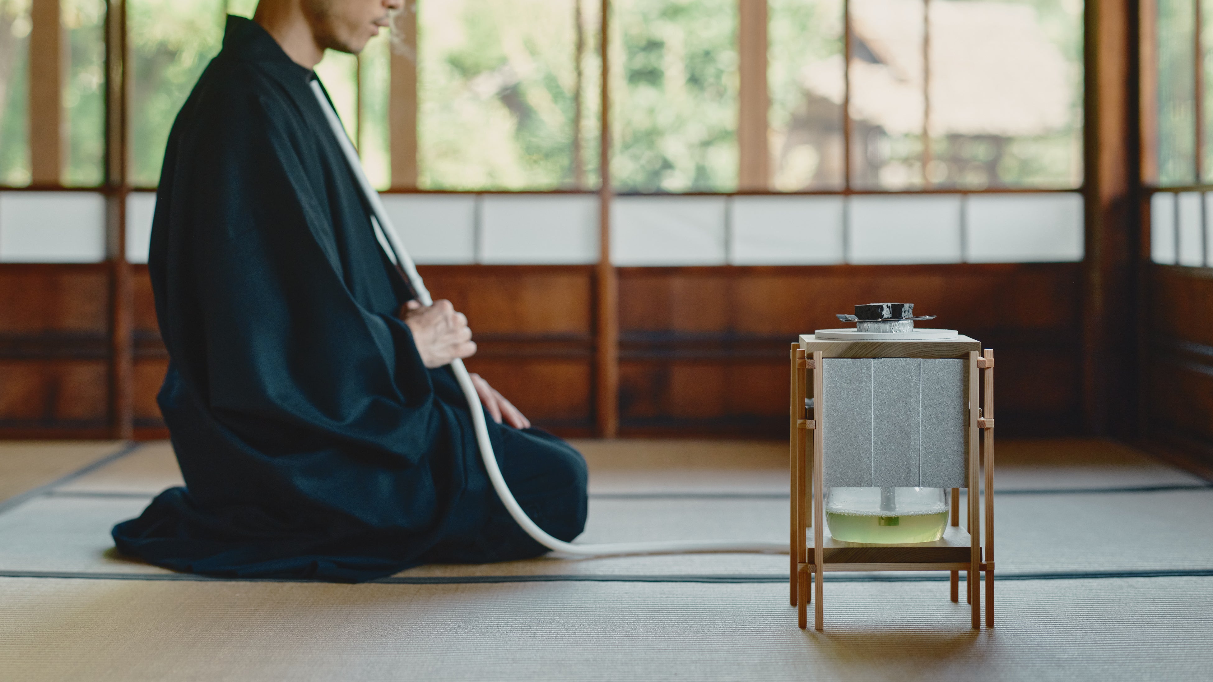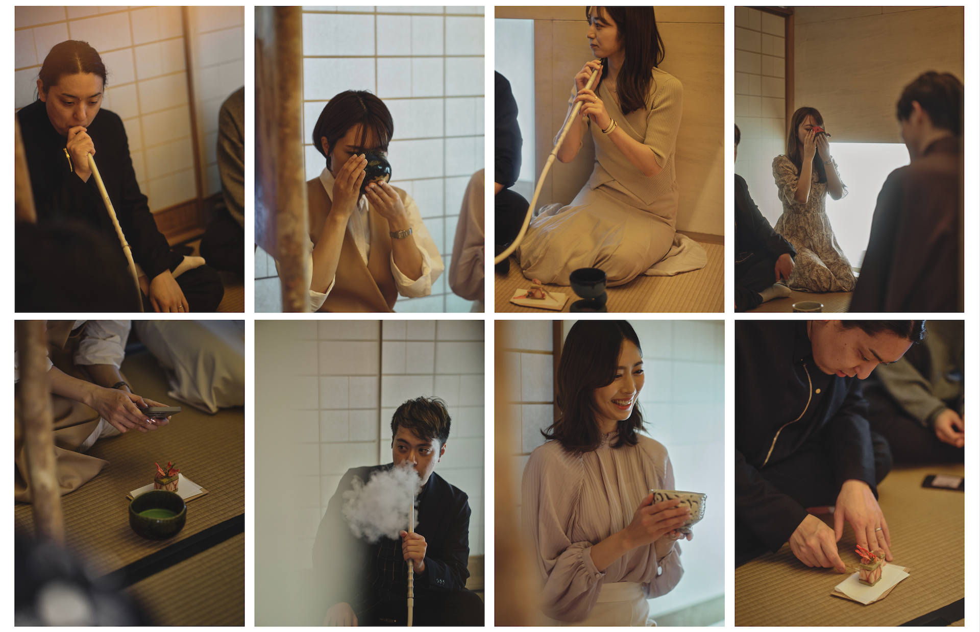 また、江戸の茶室でタバコを吸うという文化的背景を引用し、タバコ葉ではなく今回限定でさくら葉をブレンドした茶葉を用いた “吸うお茶” が振舞われました。茶会の新たな形の模索として、京都を拠点に活動するアートコレクティブの「Ochill(オチル)」との協業により実現しました、水タバコの原理を応用し、タバコ葉ではなく [茶葉] を使用したノンニコチンの新たな嗜好品です。
