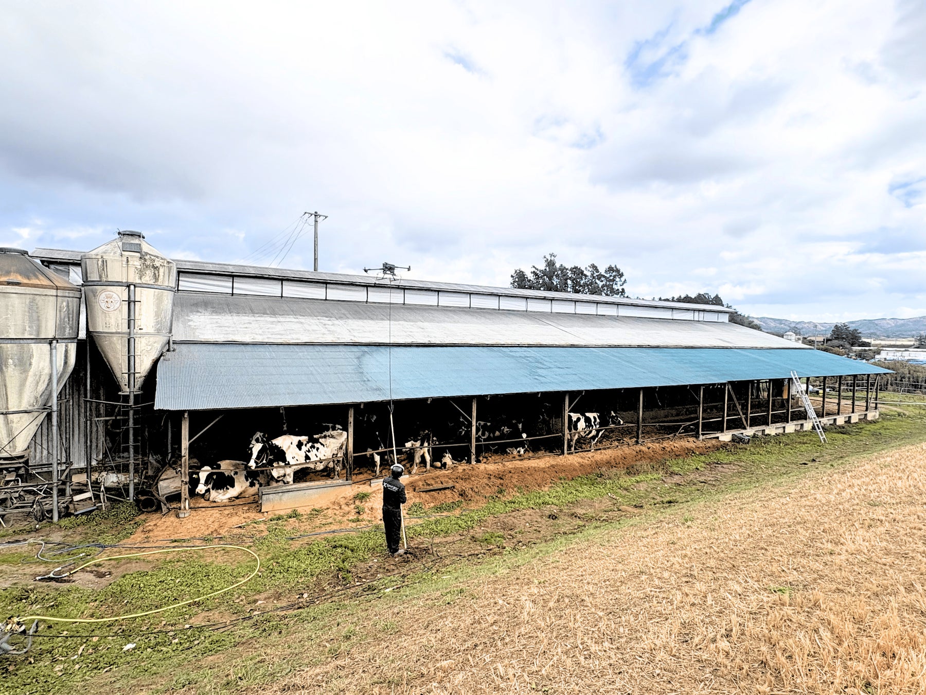 今回は、宮城県内の6つの酪農家の牛舎にて施工を実施、ドローンを活用した効率的な暑熱対策の有効性や、現場導入に向けた運用面の確認を行っています。