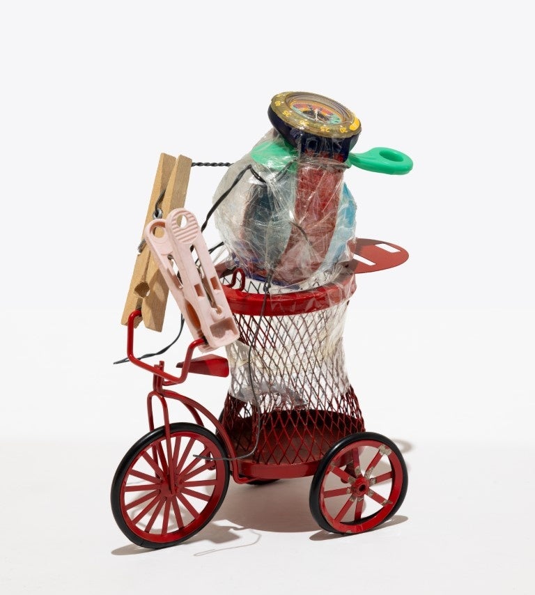 路上に落ちていたモノを拾い集めてつくったオブジェや、独特に着飾った派手な服装で町中を行くパフォーマンス、また自分の知る人々の顔、関心のある乗り物の精巧な再現など、ここでは、社会との交わりを感じさせる作品を展示します。