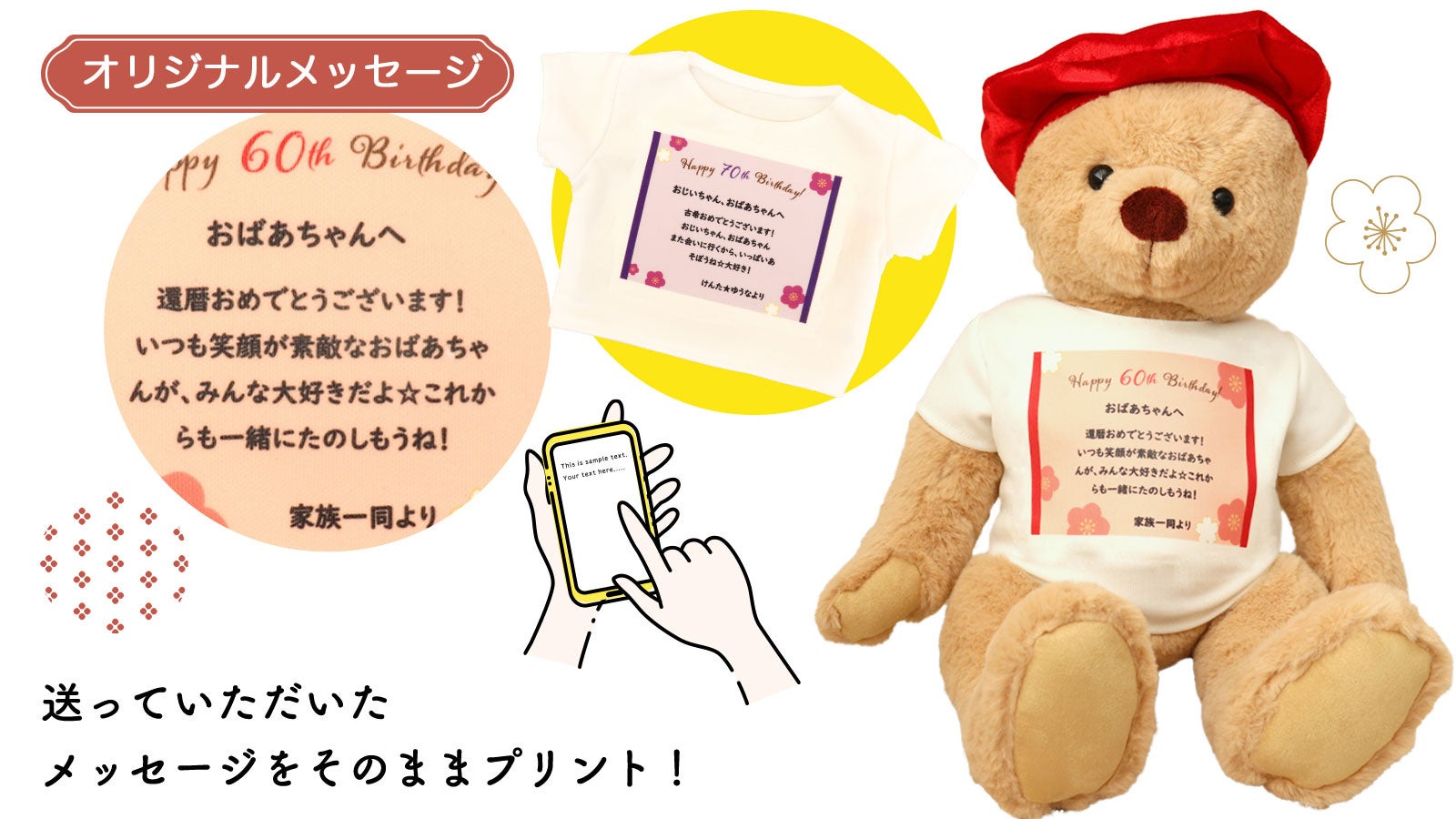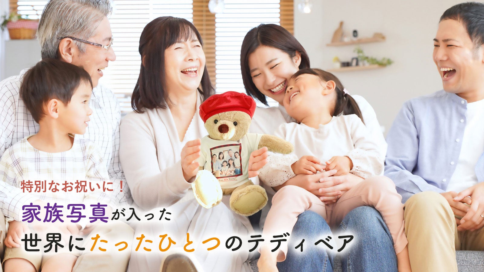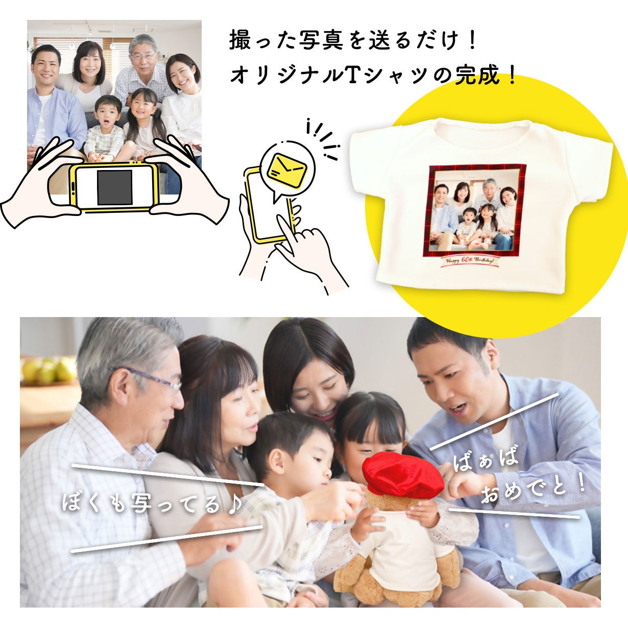 「ファミリー長寿ベア」はTシャツに、オリジナルの写真またはメッセージをプリントした「家族の想い」がカタチになる、記念写真のようなテディベア