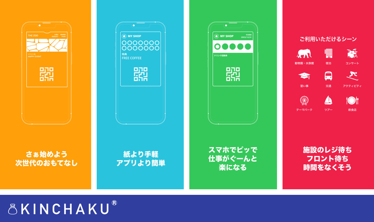 KINCHAKUは、単なるパスの販売だけでなく、顧客情報や行動履歴を元にした集客・販促、売上管理・分析が可能で、サービスやオペレーションのスマート化を実現できるプラットフォームです。多言語(日本語、英語)対応、およびサブスク(継続課金)型ビジネスにも対応しており、鉄道やバスなどの公共交通機関、映画館・動物園・水族館・テーマパークなどのレジャー施設、飲食店や習い事、サロン、スポーツ施設など幅広い分野で導入されています。