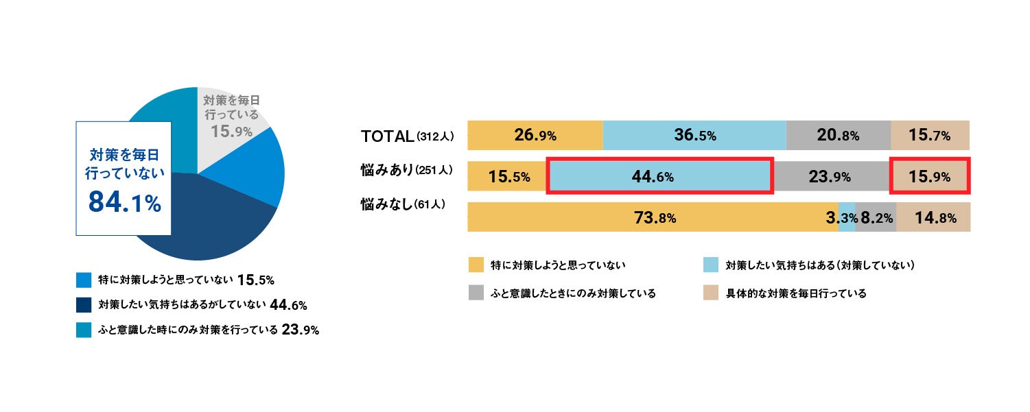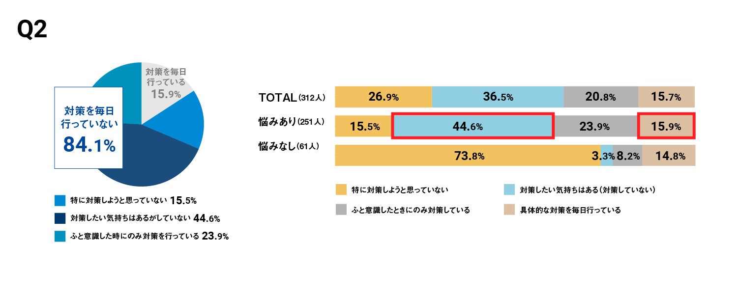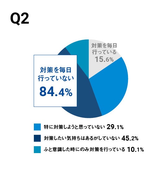 具体的な対策を毎日行っている人は約15%、対策をしたい気持ちはあるが対策を実施していない人は約44%。
