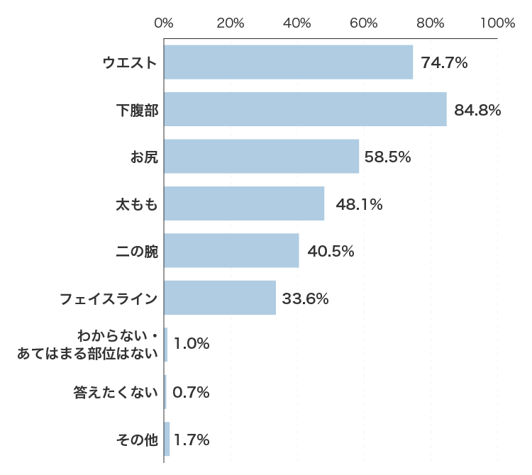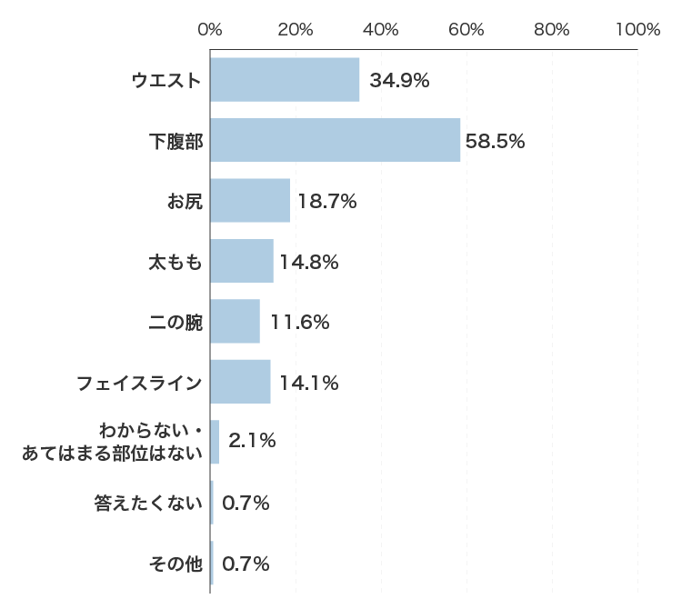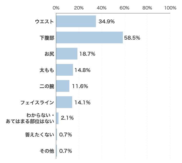ウエストと答えた方も約75%に。お尻、太ももなどを合わせ下半身の答えが圧倒的です。