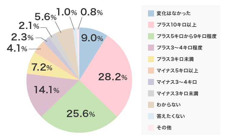 半数以上の方が、5キロ以上の体重増加。10キロ以上も3割近くに
