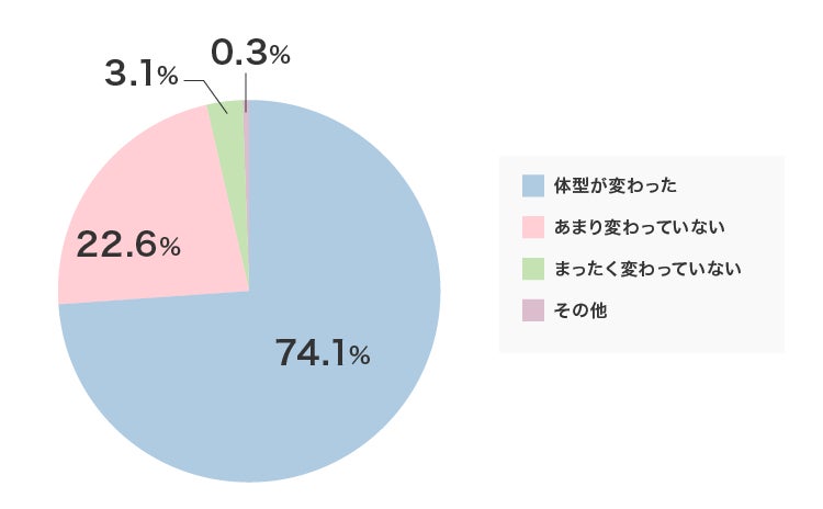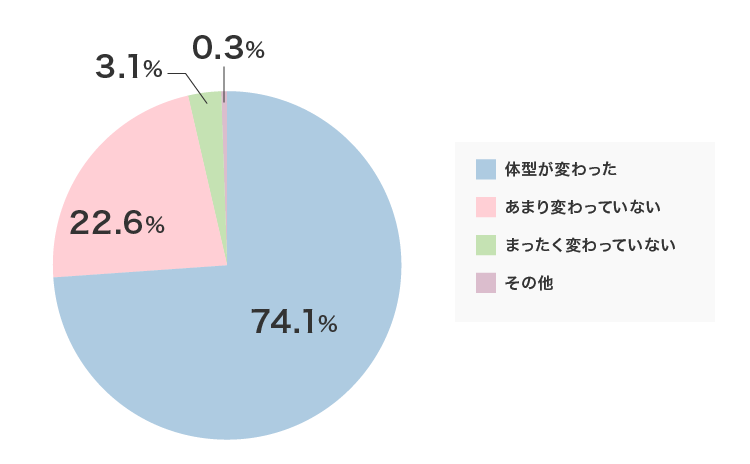 体型の変化は4人に3人が変わったと答え、まったく「変わっていない」と答えた方は3%にすぎませんでした。