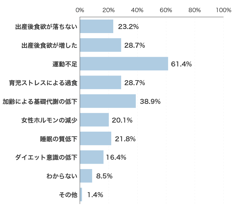運動不足をあげた方は6割をこえました。加齢による基礎代謝の低下や女性ホルモンの減少などをあげた方も多く食欲要因を上回ったことが注目されます。出産年齢の高齢化も影響しているかもしれません。