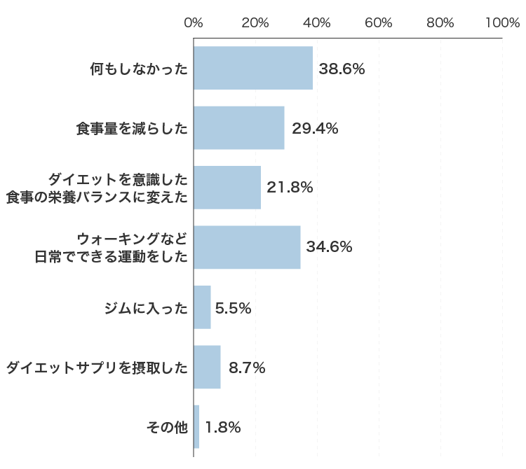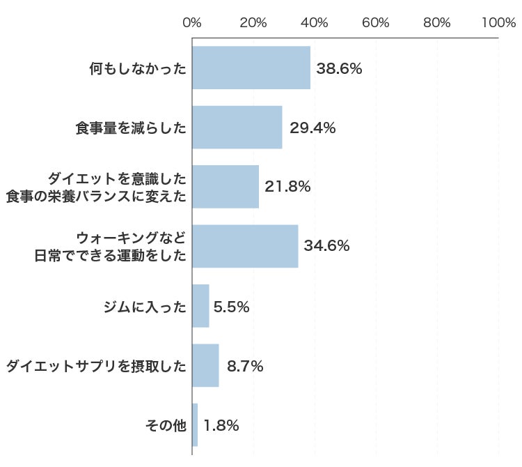 出産後、体重が増えたり体型の変化を感じても「何もしなかった」と回答した方が4割もおいででしたが、これは産後の子育ての忙しさに原因があると思われます。食事や運動など日常でできるダイエット法を選ばれた方が多いのも、子育ての忙しさが関連しているのかもしれません。