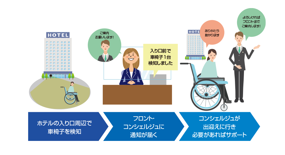バリアフリー化がまだできない、バリアフリー化が途中の場所でも、設置したカメラの画像からサポート対象(車椅子)を検知し、施設管理者やフロント・コンシェルジュなどへ通知するシステム