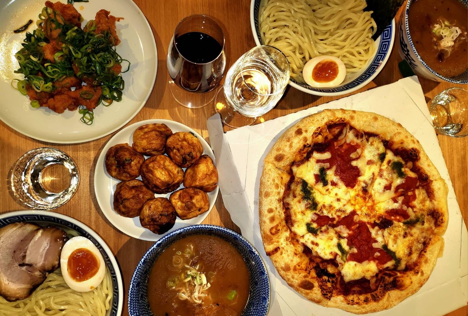 当店は、お料理の持ち込みやデリバリーが可能なため、食い倒れの街としても有名な心斎橋グルメを自由に持ち込むことが出来ます。スタッフがリサーチした近隣人気店やお勧めの店舗情報をご用意しており、当店1店舗で心斎橋グルメを堪能することができます。また店内では、東京神田の人気店「つじ田」が監修するつけ麺を提供しております。