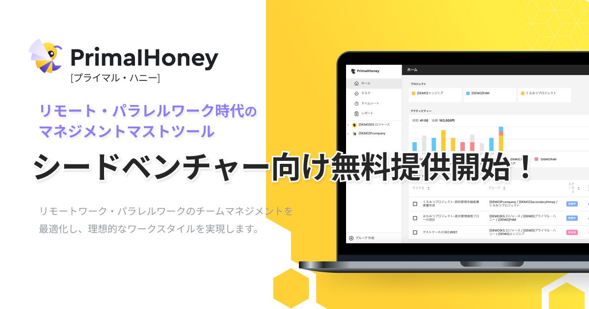 「PrimalHoney(プライマルハニー)」を利用することで、業務の予実管理などをシステム化を図り、様々な業務形態の方々を活用しながら、事業の急成長を図っていくことができるよう支援できればと思い、今回、個人のタスクや情報管理ツールのハブとなるSaaS型マネジメントツール「PrimalHoney(プライマルハニー)」をシードベンチャーに向け無料提供をいたします(※)。