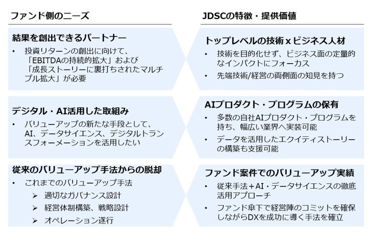 JDSCは、AIの技術を活用してビジネス面で定量的なインパクトを創出するという強みを活かし、IAPの投資後のバリューアップを強力に支援いたします。