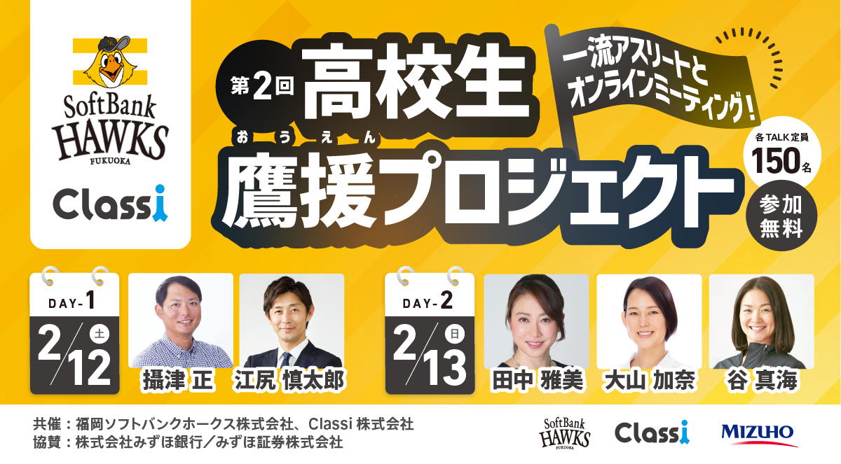 未来を切り拓いていく全国の高校生に向けて、Classiと福岡ソフトバンクホークスは「第2回 一流アスリートとオンラインミーティング!高校生鷹援プロジェクト」を開催します。
