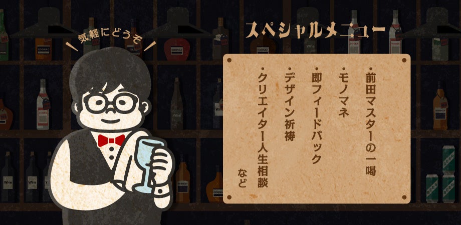 『勝てるデザイン』の中には“デザインはデザイナーだけのものではない”というフレーズがあり、これは前田のデザイナーとしての活動理念でもあります。デザイナーはもちろんですが、ビジネスパーソン、学生…多くの方とバーで交流できることを期待しております。