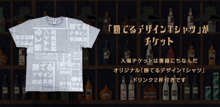 『勝てるデザイン』の1周年記念イベントなので、書籍のオリジナルTシャツが入場チケットとなっております。チケットを購入いただいた方にはTシャツと2ドリンクがセットでついてきます。