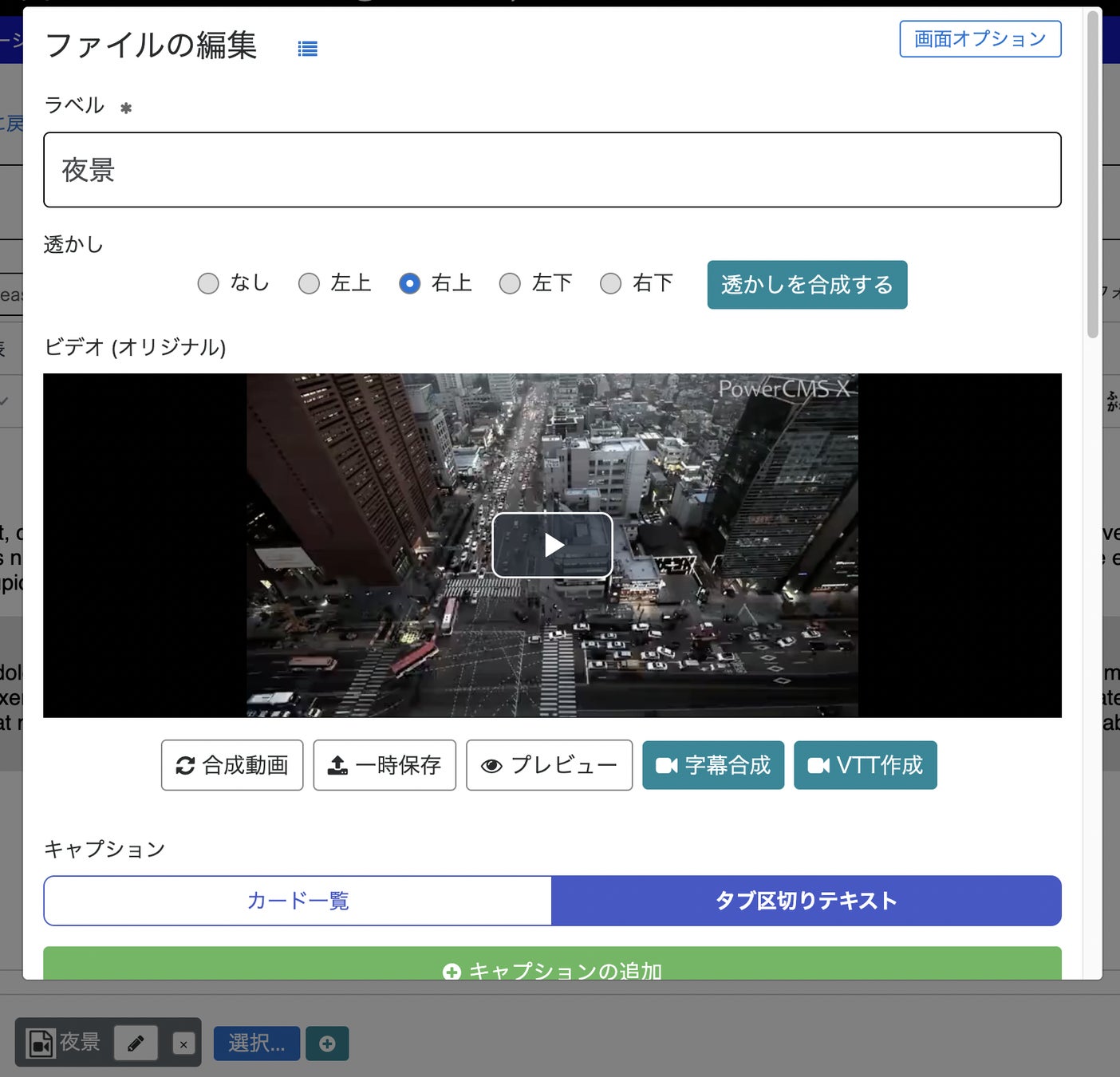 PowerCMS Xの「VideoCaptions」プラグインにより、アップロードした動画ファイルに対する字幕作成は CMS上で完結するようになります。