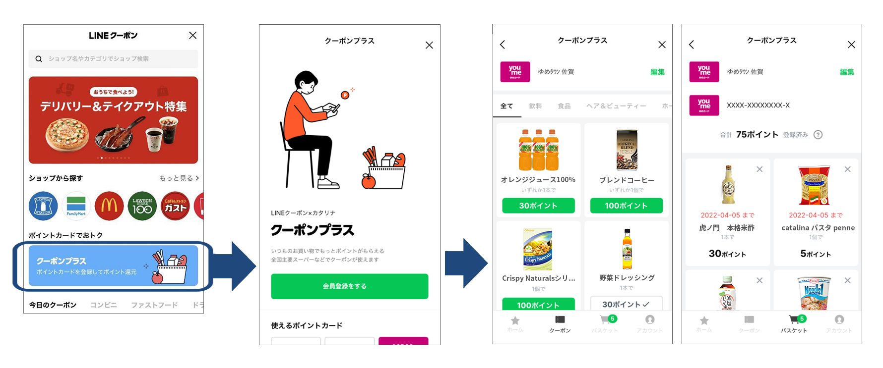 ゆめカードなどの各店舗ポイントカードを連携していただくことで、「LINEクーポン」メニューから「クーポンプラス」で対応している複数のポイント還元クーポンをまとめてご利用いただくことが可能で、お買い物前にチェックすることで欲しいクーポンを効果的に選んでご活用いただけます。