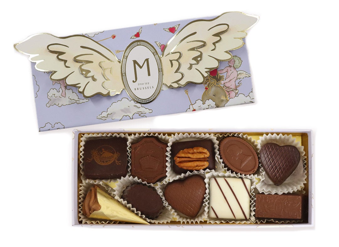 「フィリップ」、「ファビオラ」など、ベルギー国王や王妃の名前に由来するショコラも入った、ガナッシュ、プラリネ、キャラメルをバランスよく詰め合わせた10粒入りです。