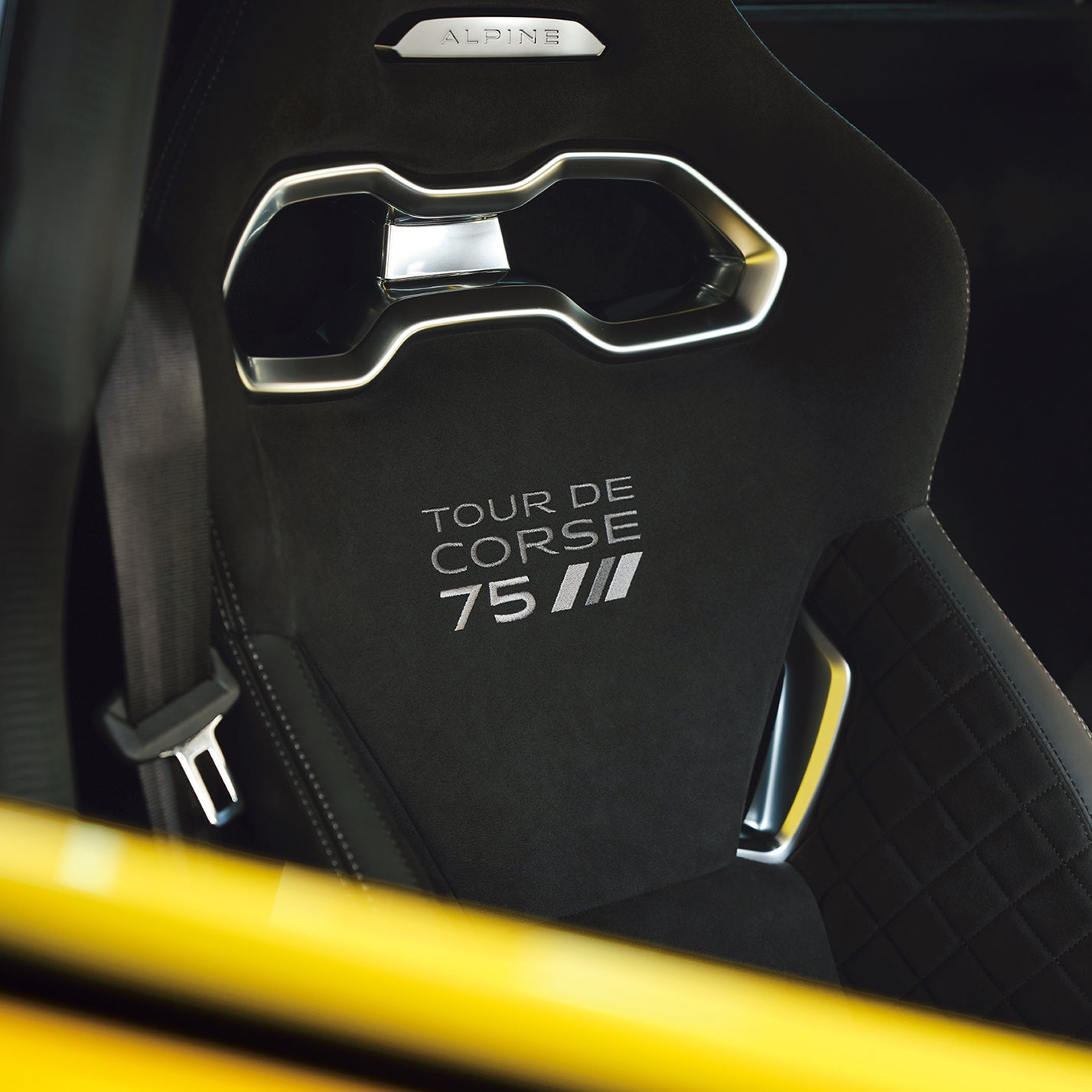 アルピーヌ A110 ツール・ド・コルス 75は、ジョン トゥルヌソルとノワール プロフォンMの専用2トーンカラー、専用デカール、ブリリアントホワイトのグランプリ・ホイールなど、1975年のラリーツール・ド・コルスを戦った先代アルピーヌ A110をイメージさせるカラーリングが施されています。