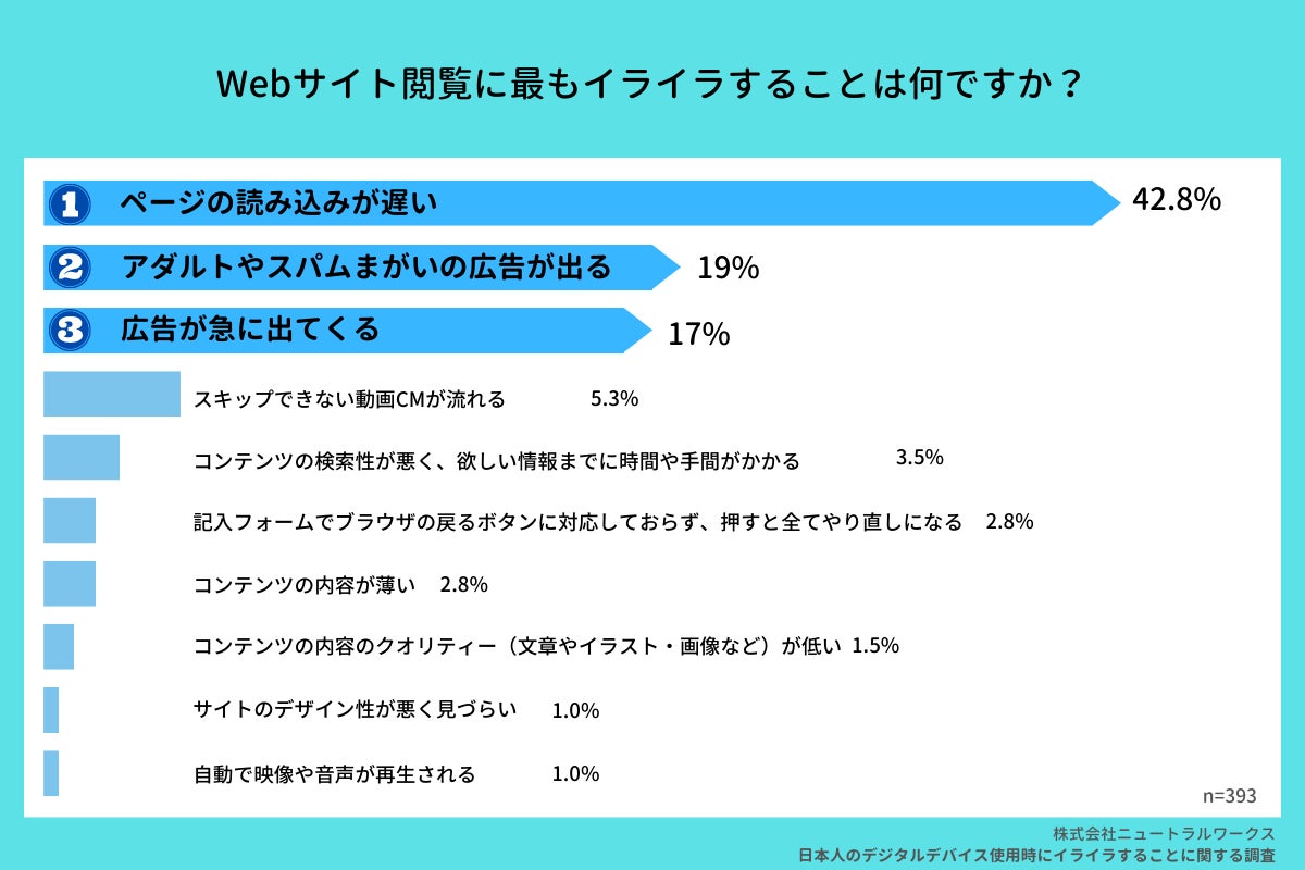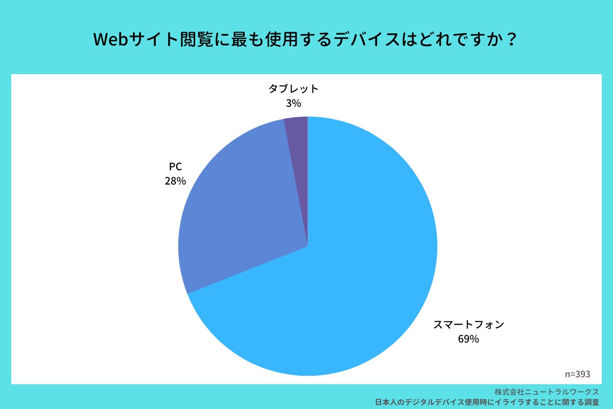 株式会社ニュートラルワークス(本社:神奈川県茅ヶ崎市、代表取締役:三木五月)は、デジタルデバイス(PC・スマートフォン・タブレット)を使用したWEBサイト閲覧時の“イライラすること”に関する意識調査を実施いたしましたので、お知らせいたします。