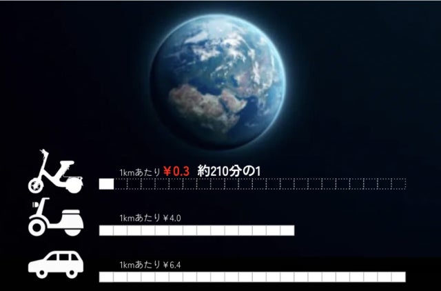 経済的効果: 電動化によるCO2排出量の削減を実現し、かつ走行に必要な電力量を費用で算出すると原付のおよそ210分の1のコストで走行することができます。