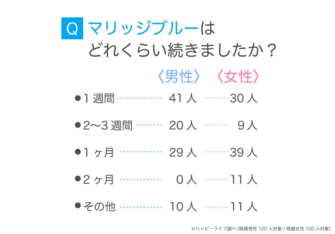 男女ともに、1ヶ月以内にマリッジブルーから立ち直る人がほとんどであることがわかりました。