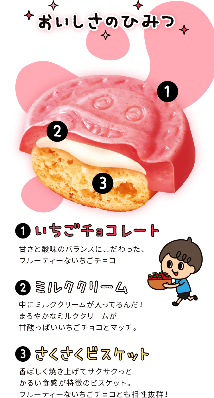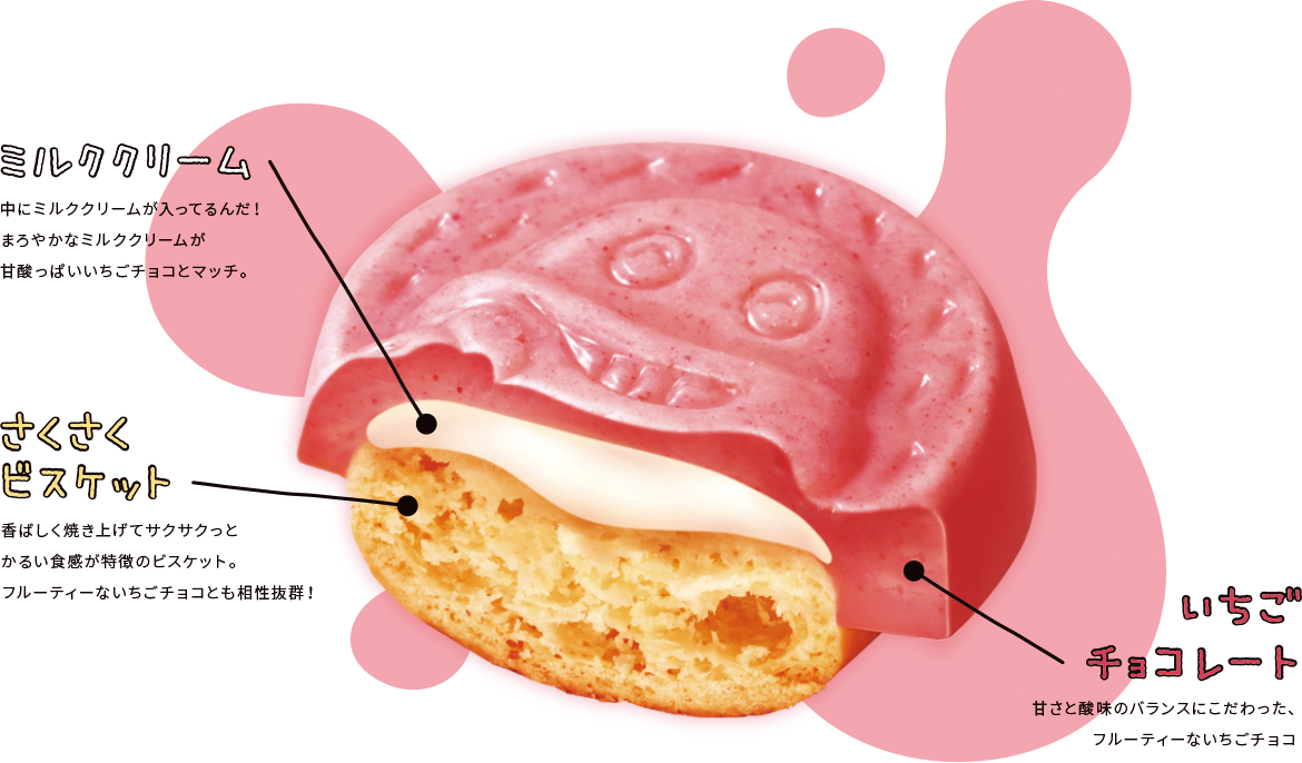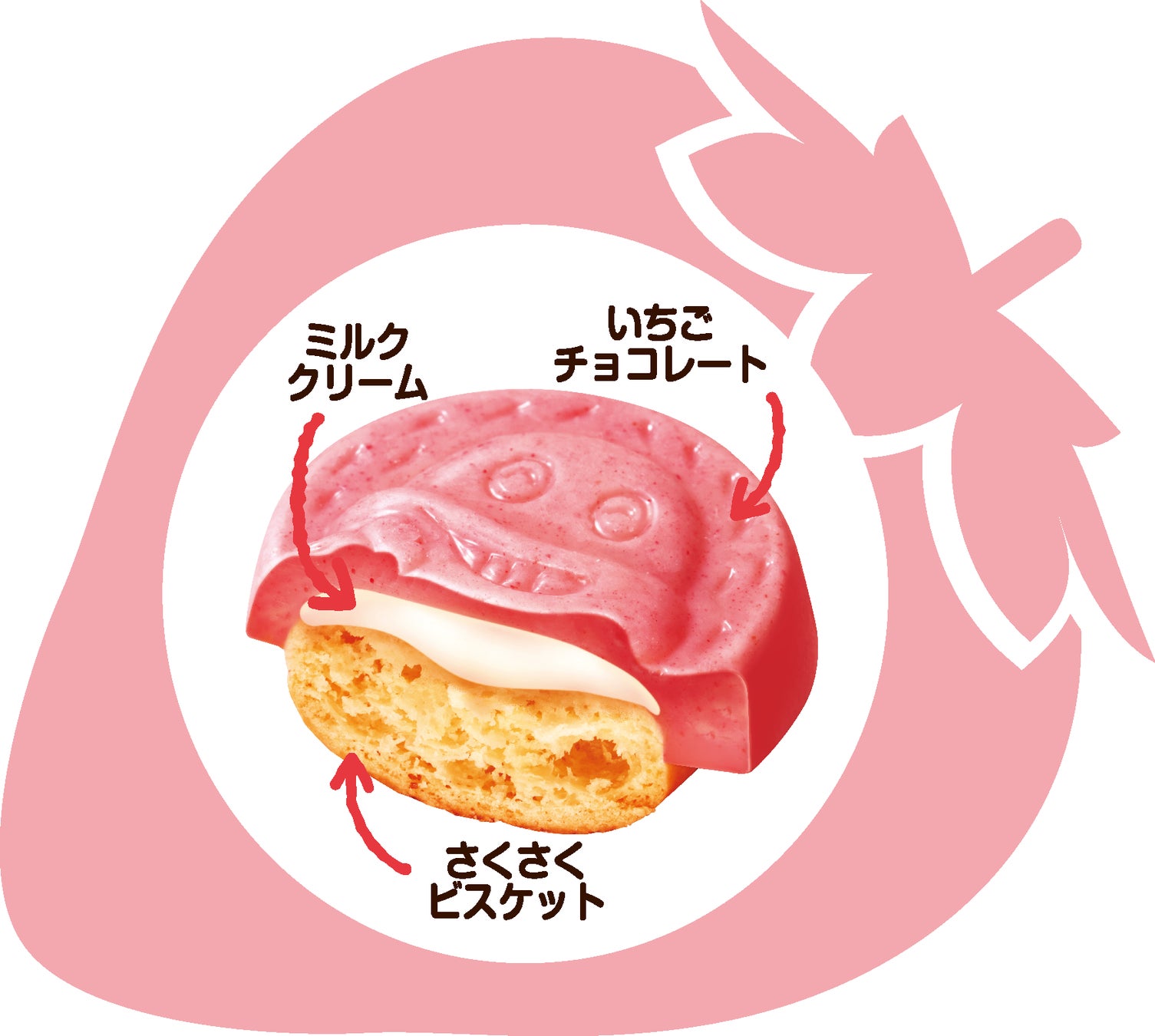 いちごパウダー入りいちごチョコレートは見た目もかわいくキュンとする甘酸っぱい味わいで、ミルククリームやさくさくビスケットとの相性も抜群です。