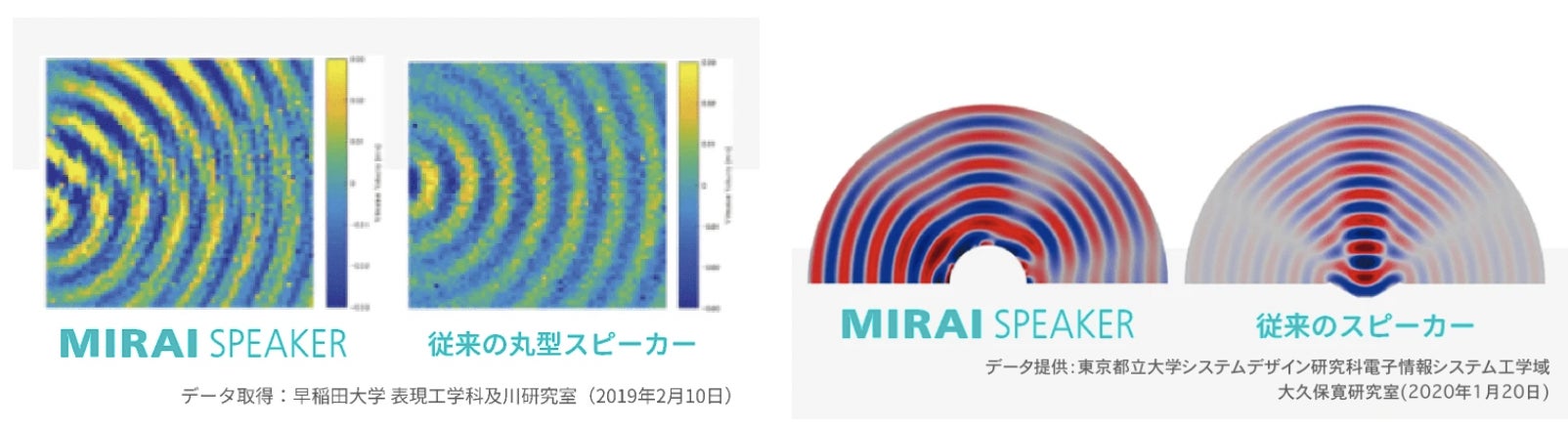 可視化が難しい音波ですが、早稲田大学の協力により、従来のスピーカーとの音波の違いが確認されました。さらに、特有の音波がなぜ生まれるのか、東京都立大学の協力により、振動板の動きからシミュレーション解析を行い、従来のスピーカーとは異なり、高音域において、広範囲にしっかりと音を届ける音場がつくられることが確認されました。今後も、スピーカー100年の歴史を変える『曲面サウンド』の音について研究を続けてまいります。