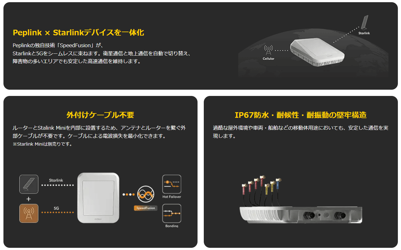 設置は簡単で、Peplinkルーターを筐体内に固定するだけ。Starlink Mini や MAX BR1 Mini、MAX Transit Duo Proなど主要ルーターに対応しており、リモート拠点や移動体通信、災害時やイベント現場など、さまざまなシーンで利用可能です。