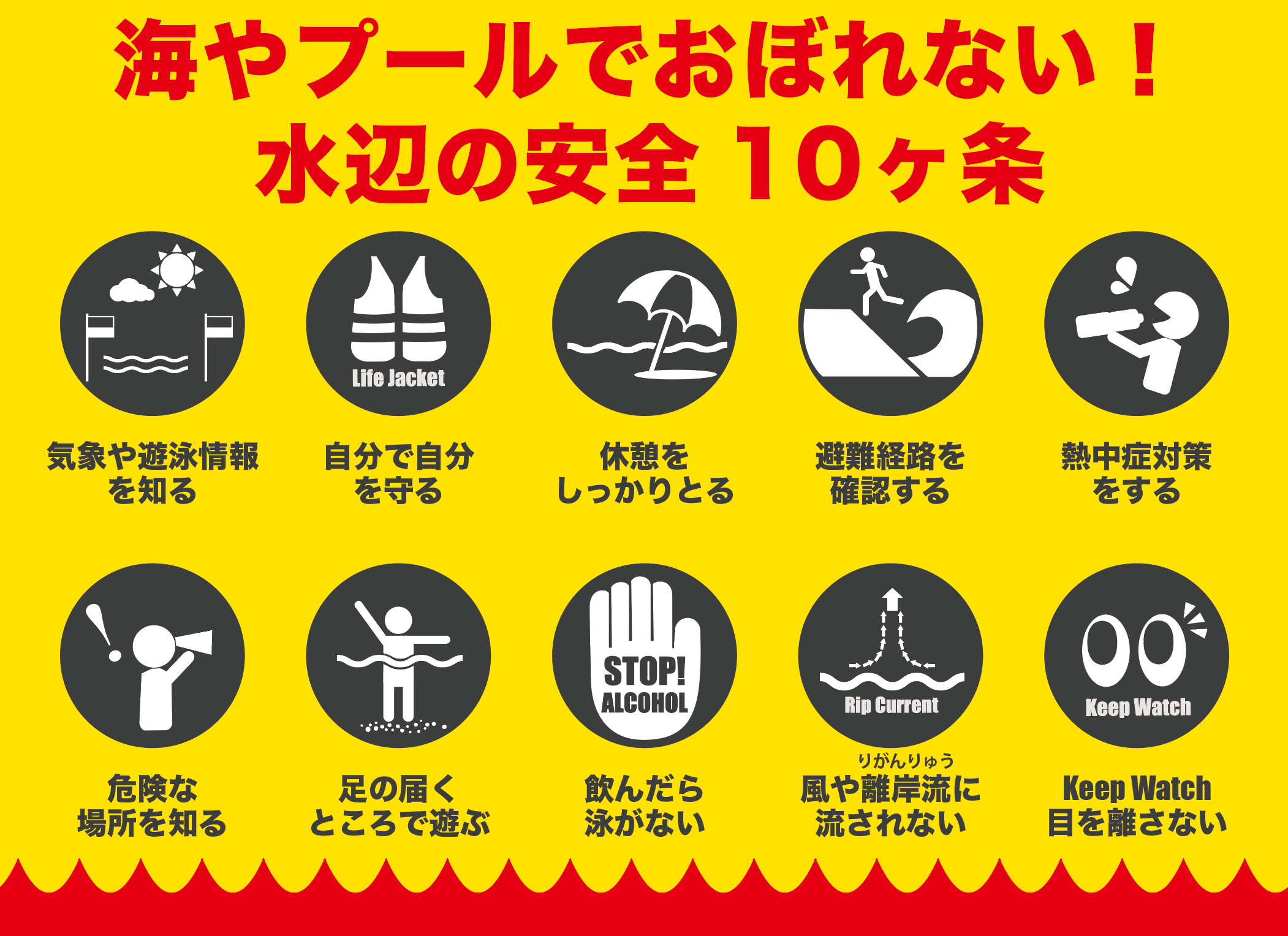 海や川、水辺に遊びに行くときの注意(飲酒をしない、お子様と一緒に水に入る、ライフジャケットを着る、天気予報をチェックする等)、7月25日が溺水防止デーであることをSNSで発信したり、家族や友達と話すなど、ぜひひとつの行動をとってみてください。