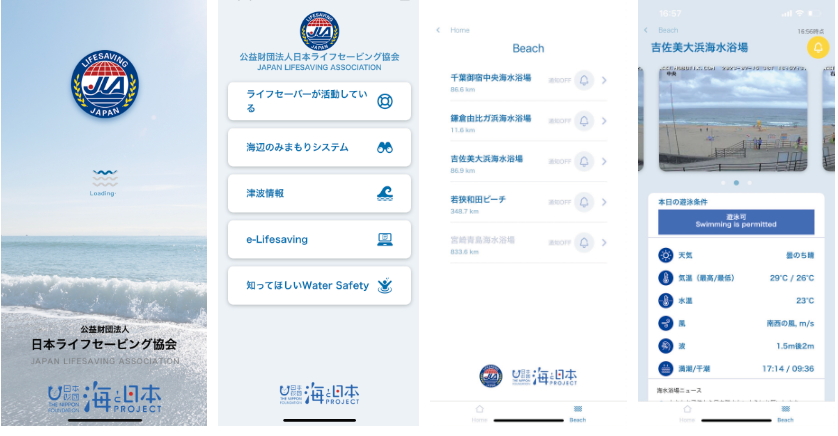 スマートフォンのアプリから海の状況や、水辺の安全情報を入手してください。現在、「海のみまもりシステム」は全国4カ所で導入されています。e-Lifesavingにもリンクしています。また、ライフセーバーが活動する全国の海水浴場や、一定の安全性が確保されていると評価された(もしくは安全性が高いと評価された)認定海水浴場の場所もわかります。アプリ検索で Water Safety と入力してください。