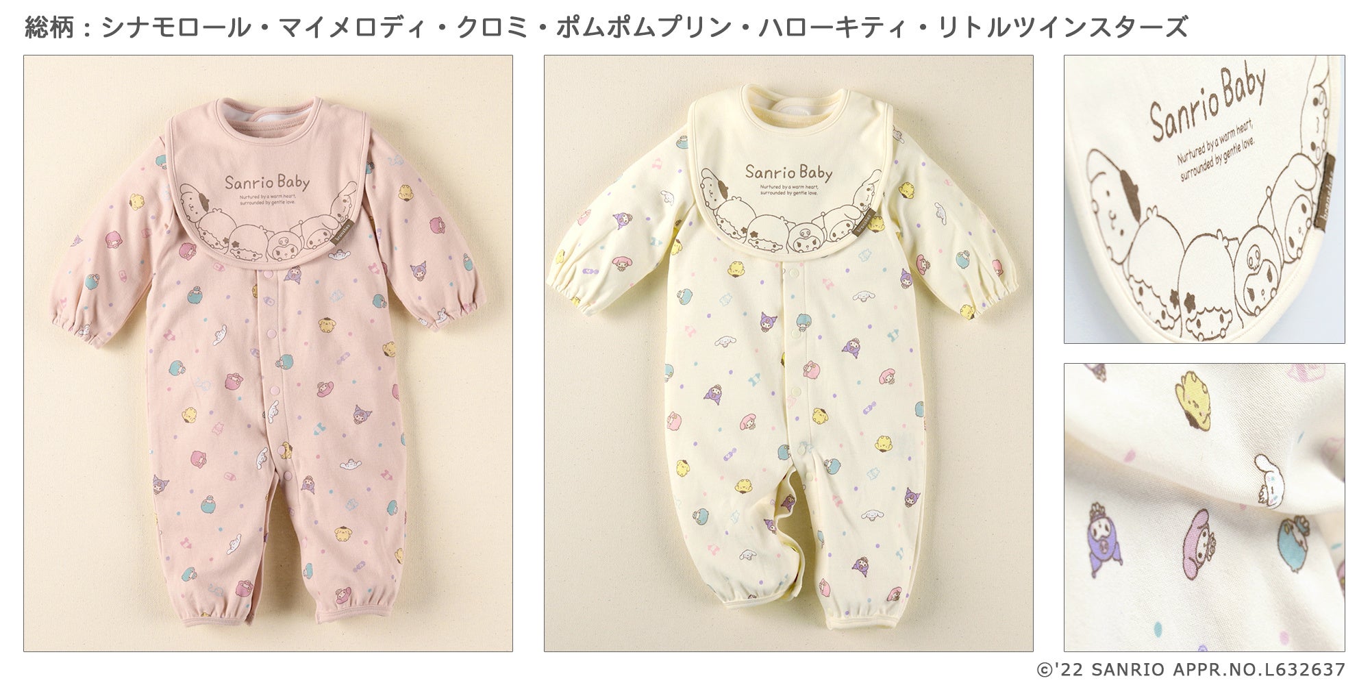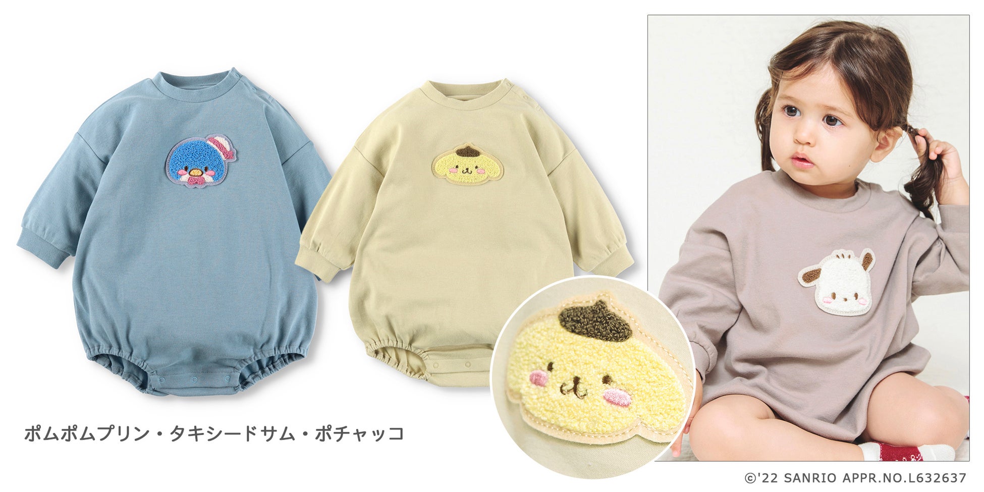 サンリオ人気キャラクターの シナモロール・マイメロディ・クロミ・ポムポムプリン・ポチャッコ・タキシードサムのサガラ刺繍ワッペンが施された長袖カバーオール。