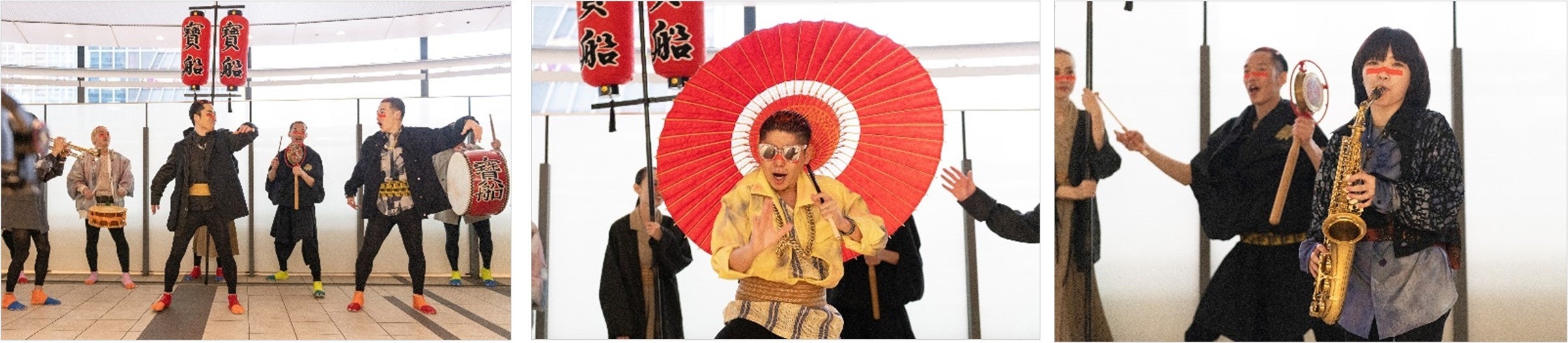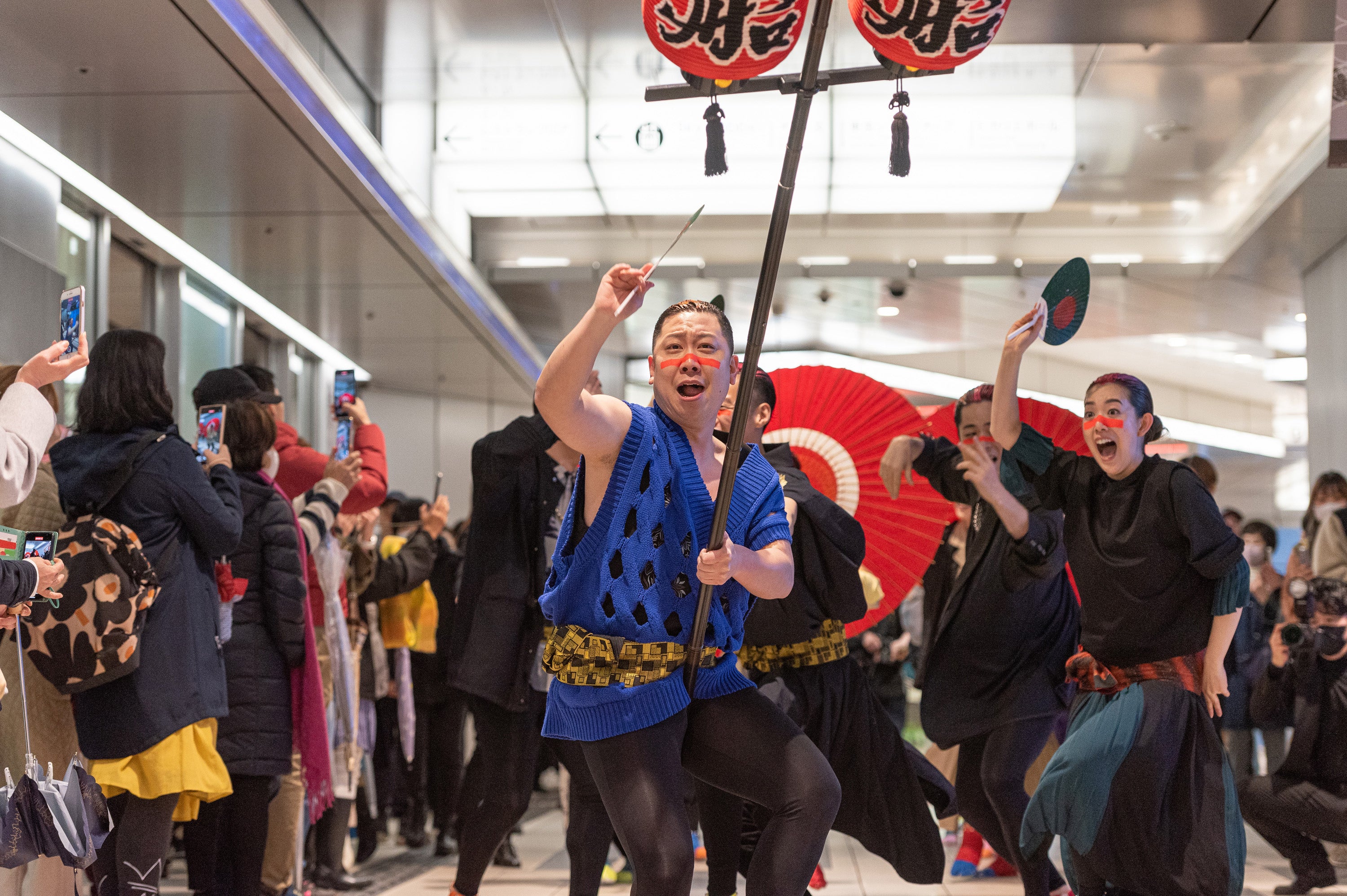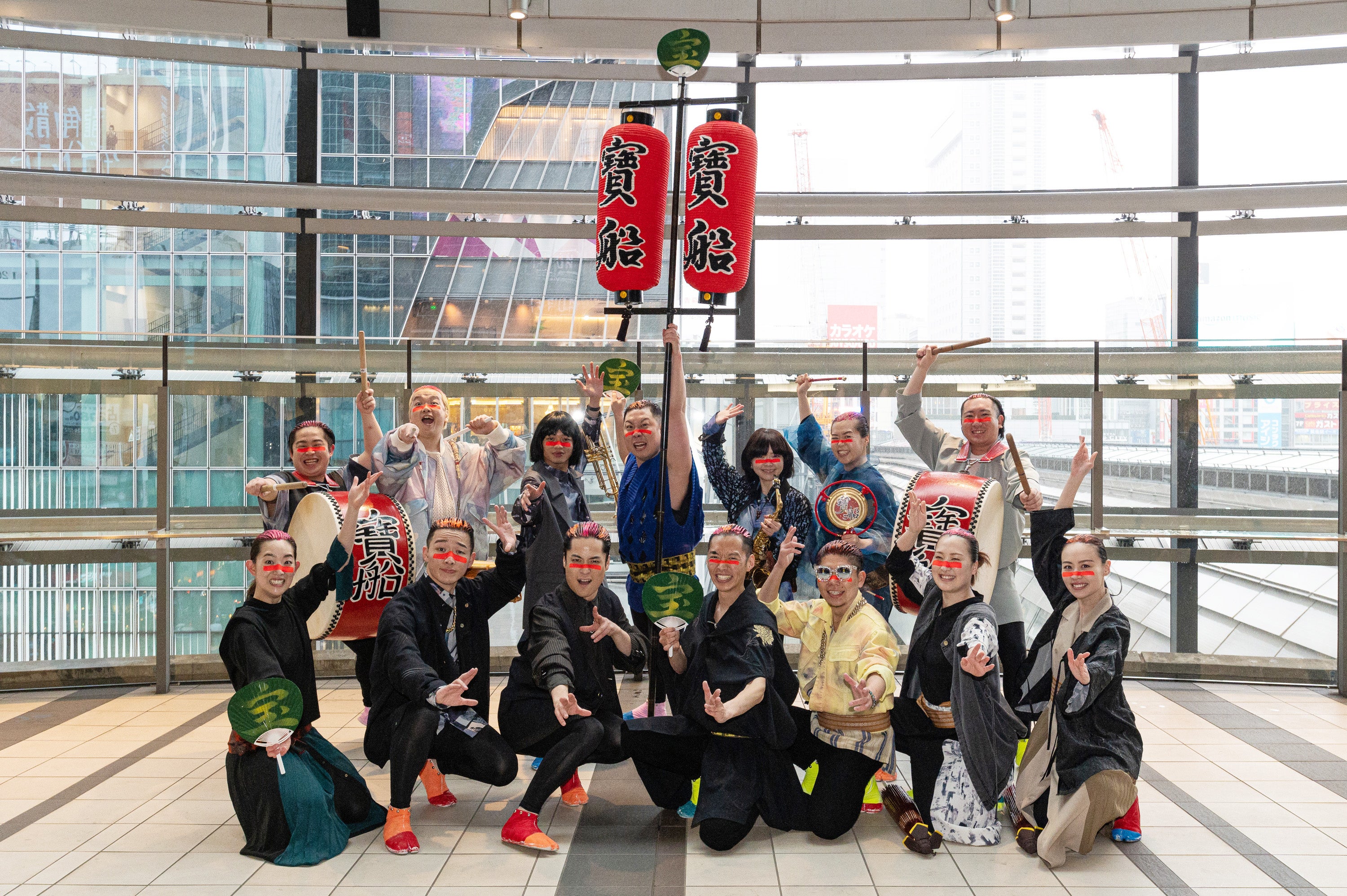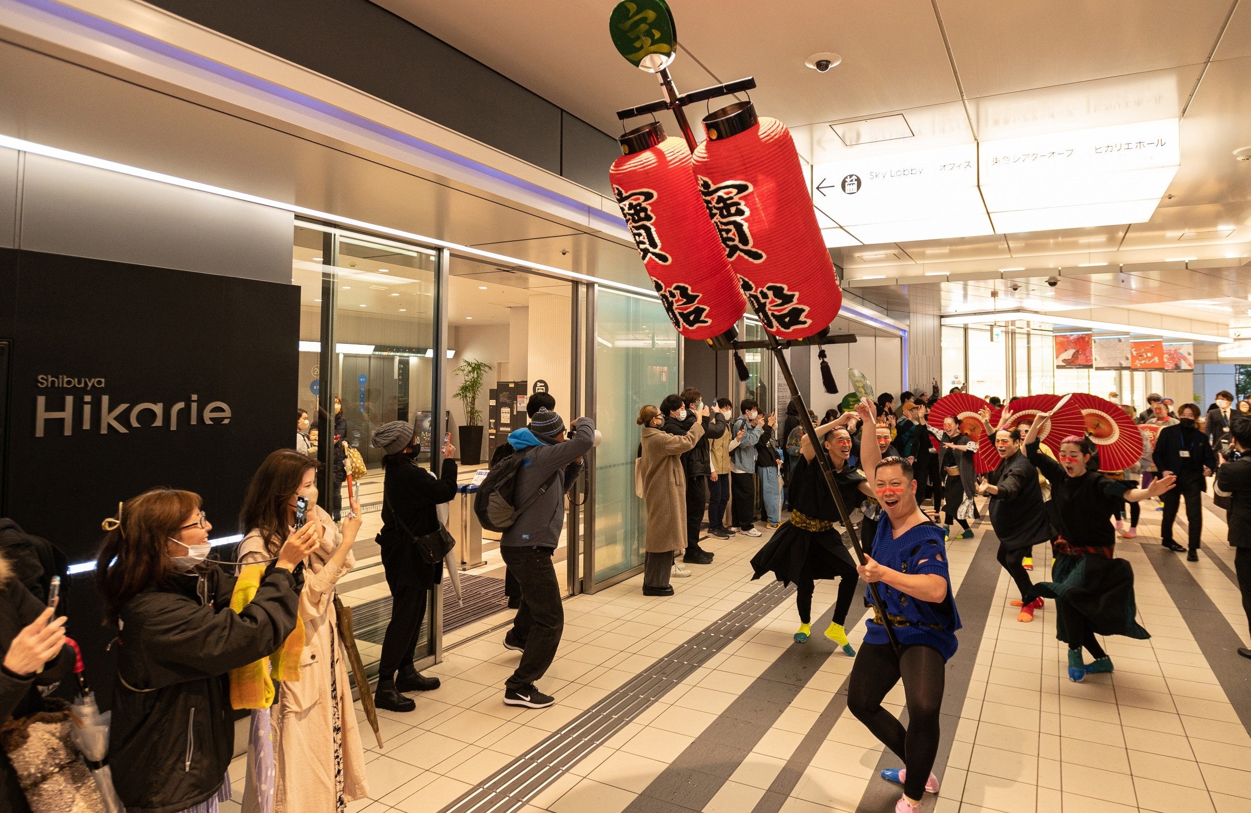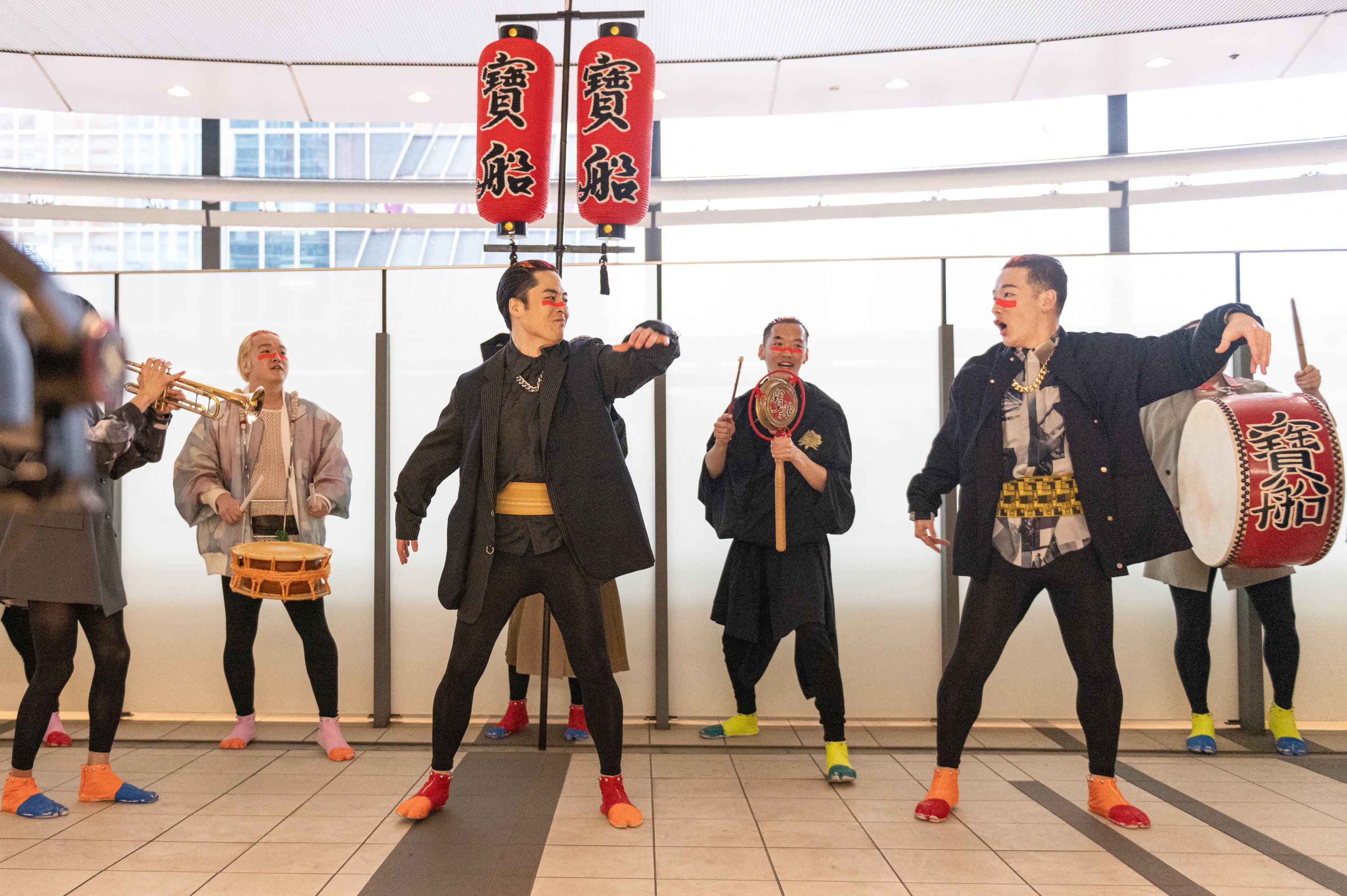 悪天候のため、当初開催を予定していたヒカリエデッキから会場が変更となる想定外の事態が発生してしまいましたが、和太鼓の音色が響きパフォーマンスがスタートすると空気は一変。「寶船」の活力が溢れる笑顔と掛け声に、ご家族連れの方から観光客など通り掛かりの方々までがぐっと引き込まれ、休日の渋谷ヒカリエがまるでお祭りのような雰囲気となりました。