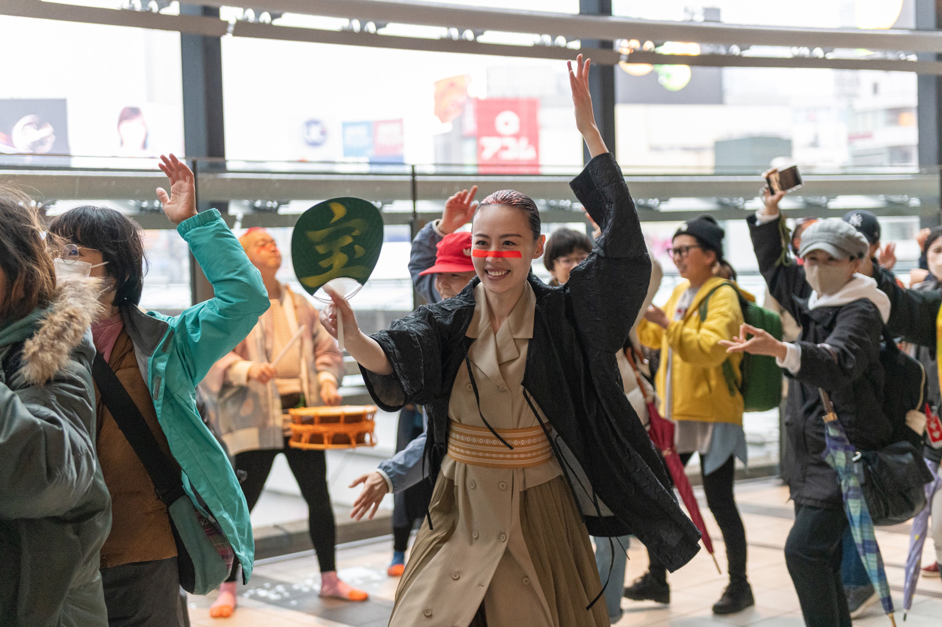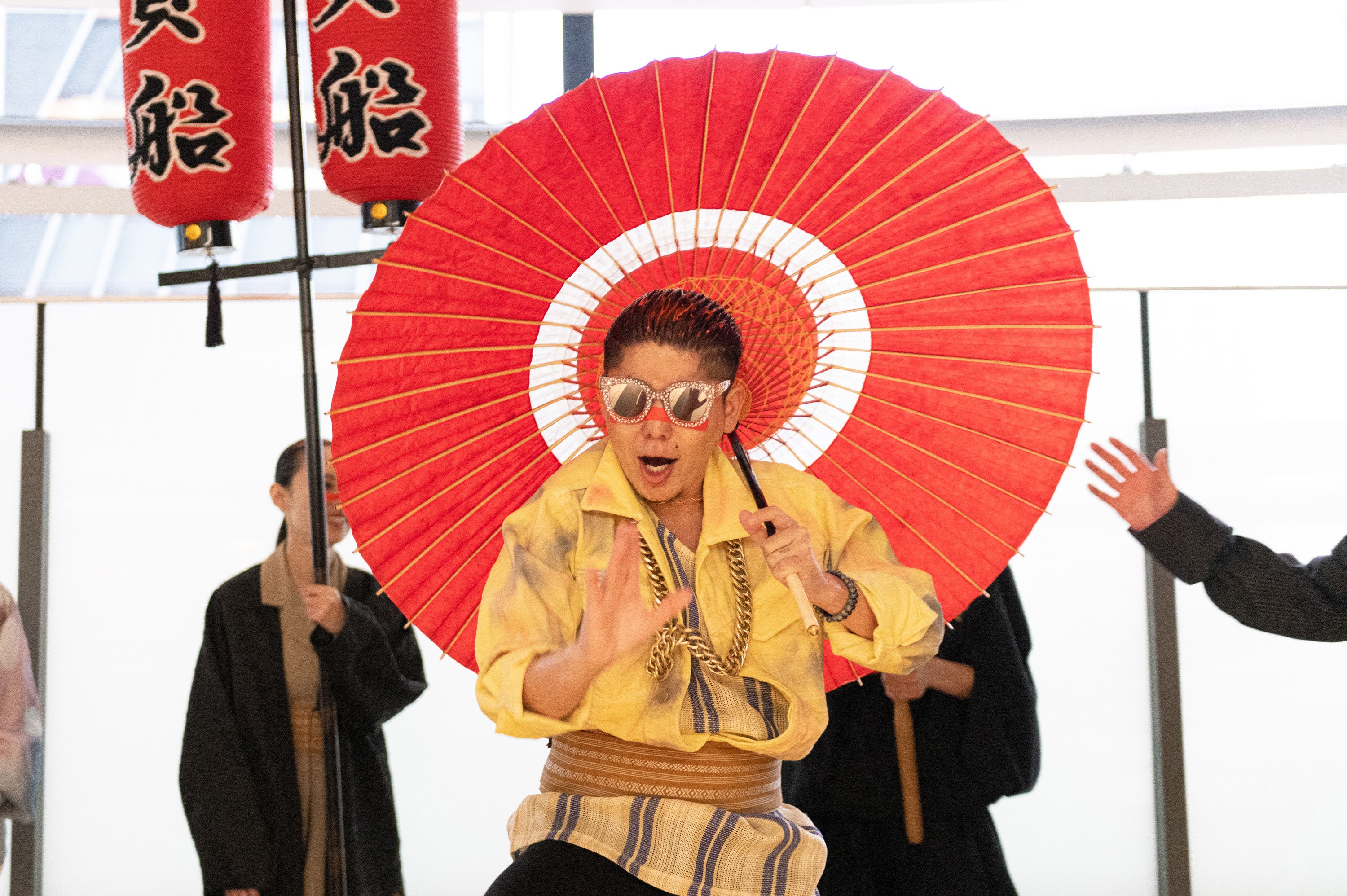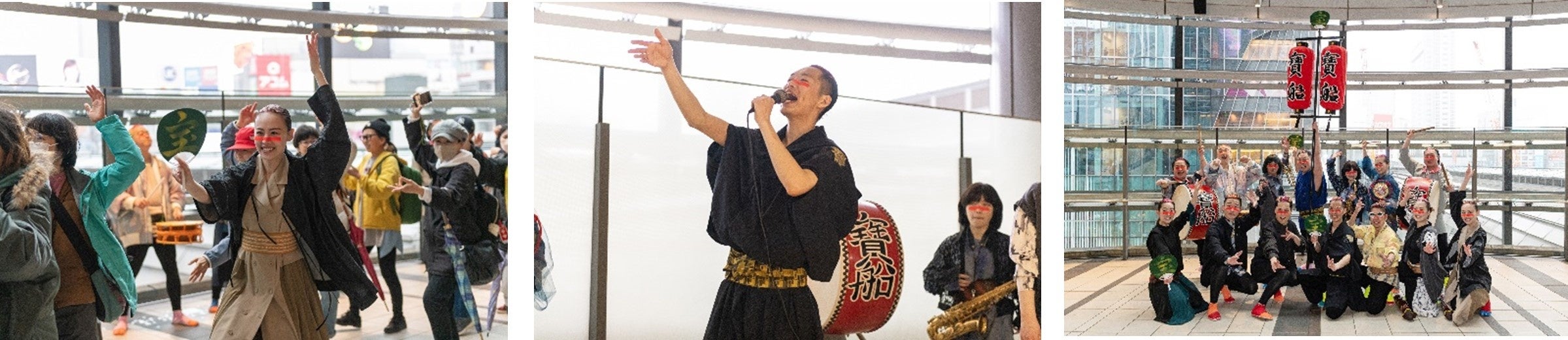 観客を巻き込み3階のアーバン・コアに移動すると盛り上がりはピークに。大勢の人々が足を止めて見入るなか「寶船」のリーダー米澤さんが「声を出して踊れる日が3年も無かったね」と自身の思いを語りました。今回のイベントが開催できた嬉しさを伝えて場を盛り上げると、そこから、特別ゲストによるパフォーマンスがスタート。阿波の音色に乗せて「FISHBOY」がアグレッシブなストリートダンスを披露し、続けて「渋谷のあっくん」が観客を沸かせると、さらにトランペット&サックスの演奏が重なり、渋谷の多彩なカルチャーを表現しました。