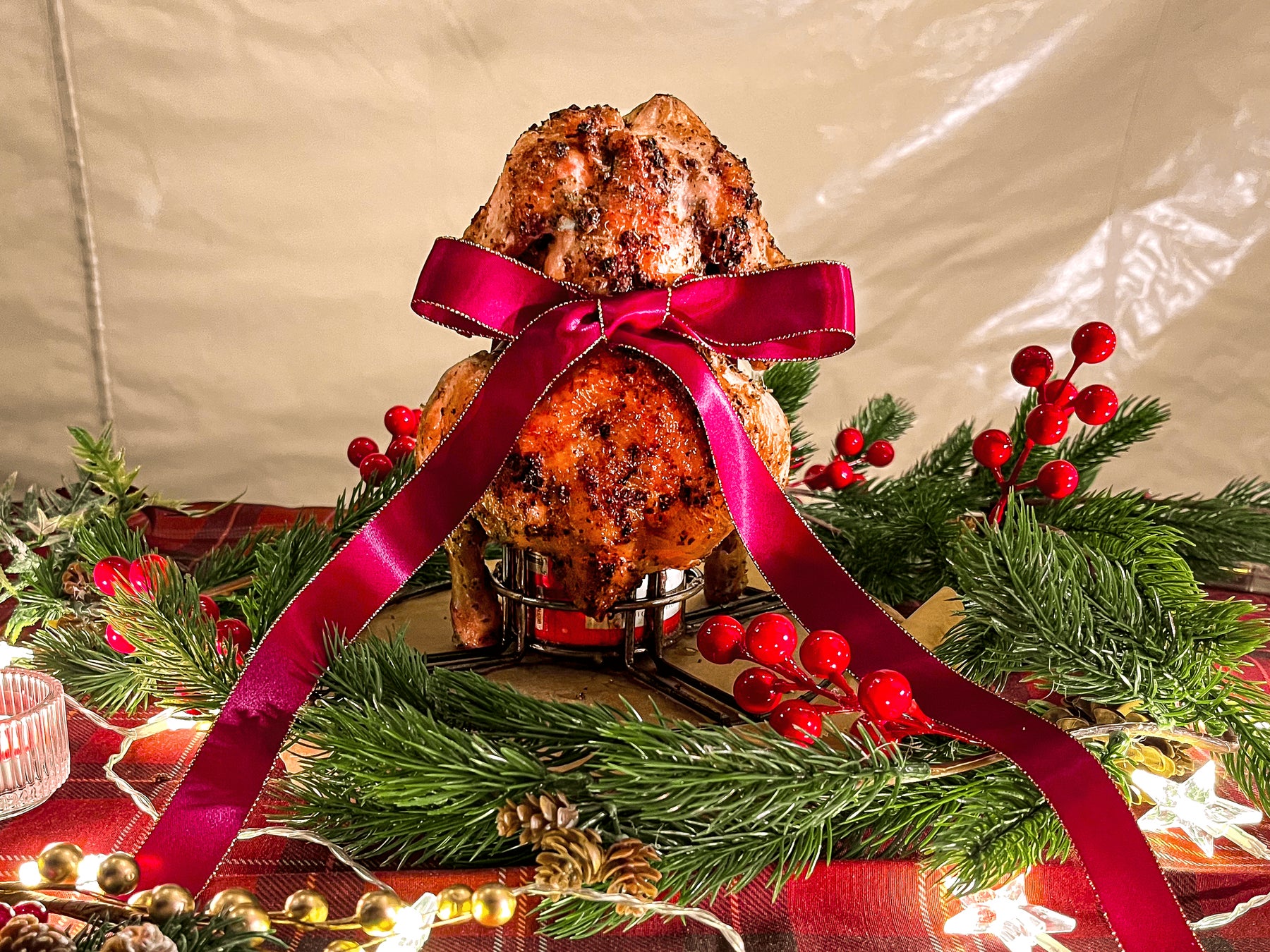 クリスマスの食卓には欠かせないチキンを、ワイルドなアウトドア料理「ビア缶チキン」にて提供。
